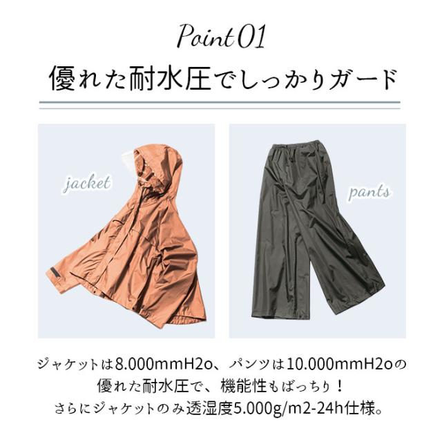 | 素材 | [ジャケット]ポリエステル100%(ポリウレタン透湿コーティング) [パンツ]ポリエステル100%(ポリ塩化ビニル引き) ※はっ水(水をはじきやすい) [付属品]収納袋 |