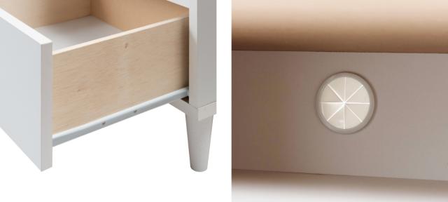 | スライドレールで開閉スムーズ 引出しはスライドレール仕様となっているので、軽い力でスムーズに開け閉めしていただけます。 | 配線穴でコードすっきり オープンスぺース背面に3ヵ所配線穴が付いています。DVDレコーダーやゲーム機などのコードを後ろに通せるので、配線がごちゃつかず片付いた印象になります。 |
