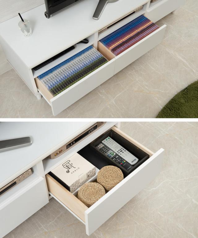 3杯の引出し収納には、DVDやゲームソフト、テレビ周りの小物などをしっかりと収納していただけるスペースを確保しています。