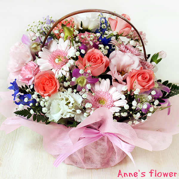■花材:ランデンファレ、ピンクバラ、トルコキキョウ、スプレーカーネーション、マリンブルー、カスミソウ、ガーベラなど