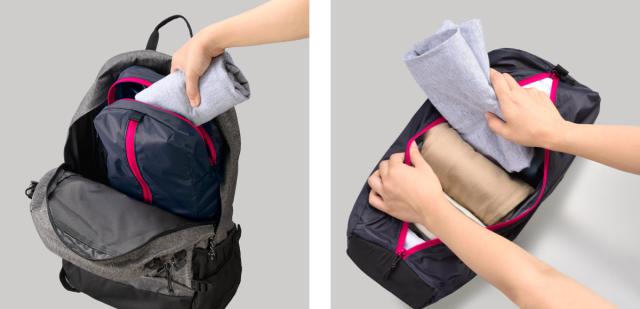縦と横どちらのジッパーからでも出し入れができるパッキングポーチです。リュックの中にタテ型に入れても、スーツケースにヨコ型で入れても、縦と横のジッパーでどちらからでも出し入れできます。使用するバッグに合わせて入れ方を変えることができ、バッグの中身をすっきり整理できます。