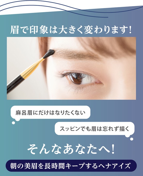 天然ヘナエキスで染める消えない眉。女性のメイクアップの基本といえば眉。長年連れ添った夫婦といえども眉なし顔は見られたくはないもの。そんなあなたにお勧めするのがこの「ヘナアイズ」。