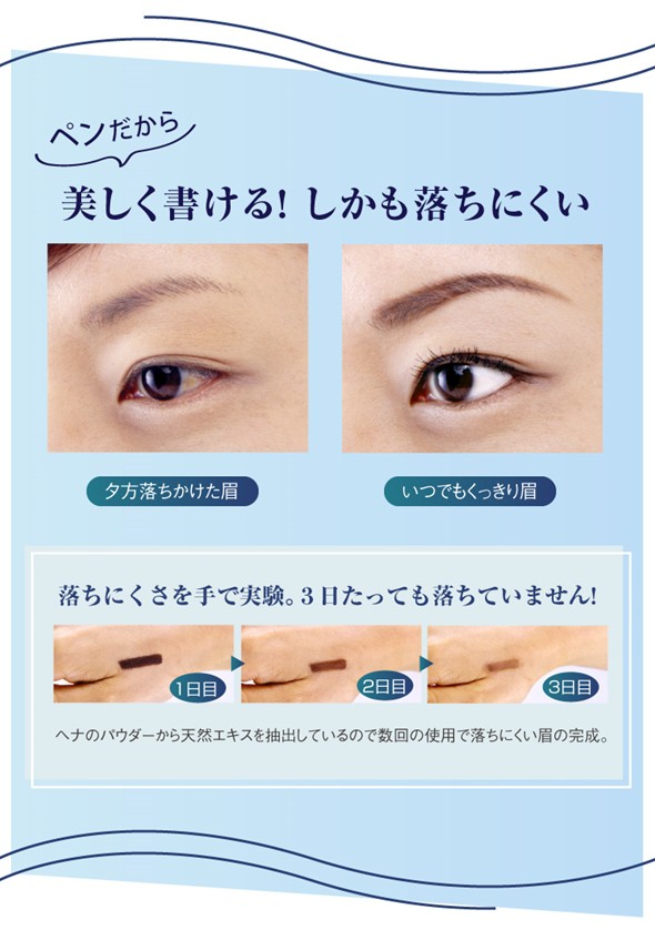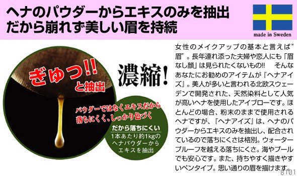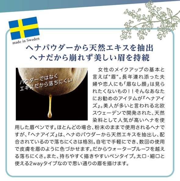 美人が多いといわれる北欧スウェーデンで開発された、天然染料として人気が高いヘナを使用した眉ペンです。ほとんどの場合、粉末のままで使用されるヘナですが、「ヘナアイズ」はヘナのパウダーから染色エキスを抽出して配合されているので、落ちにくさは格別!