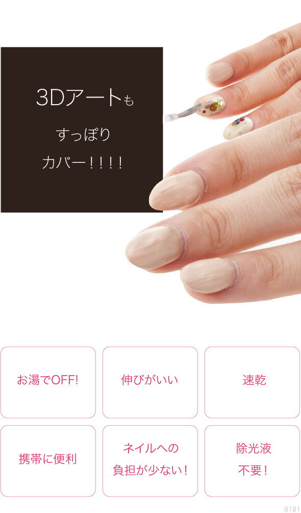 ジェルネイルを一日だけ隠したい時にご使用ください。特に急な出張や冠婚葬祭,フォーマルな場面の間際にご使用頂き、いつでもどこでも直ぐにジェルネイル等を隠す事ができます。また、爪の下にあるジェルネイル等に傷をつける事なく、剥がす事ができます。