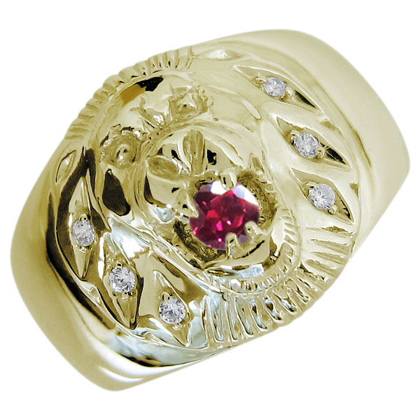 7月誕生石ルビーを一粒使用した、18金製のライオン(Lion)モチーフメンズリング(指輪)です。