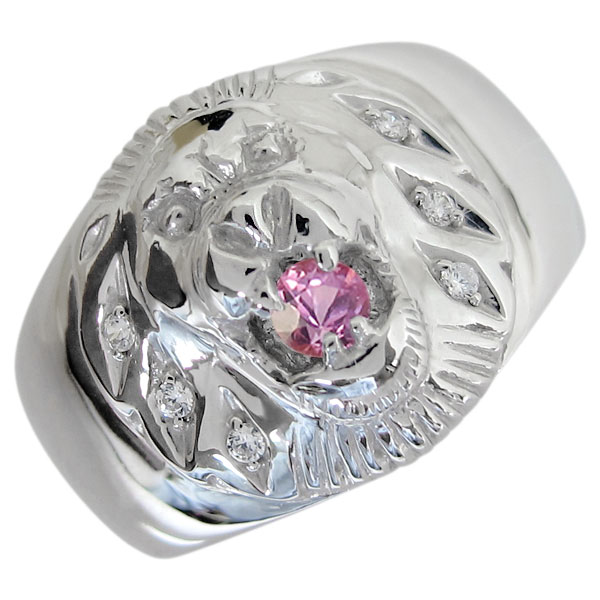 9月誕生石ピンクサファイアを一粒使用した、シルバー製のライオン(Lion)モチーフメンズリング(指輪)です。