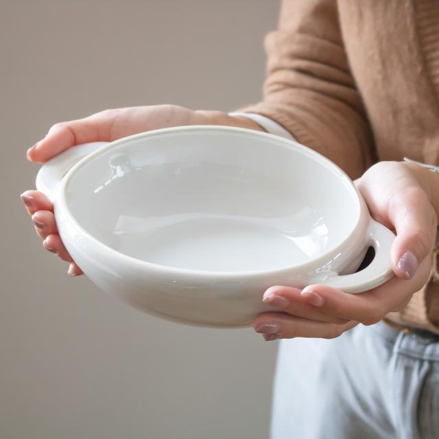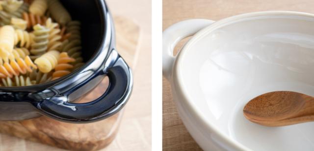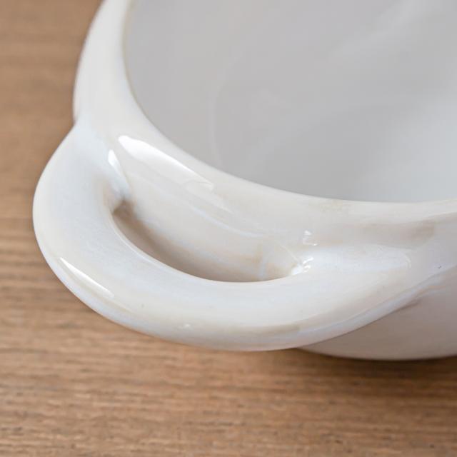 大きく平らな持ち手となっており、持ちやすく、ミトンをしていても安心して持ち運べます。また底面は角が無くなめらかで、スプーンですくいやすく、うつわの縁が内側にカーブしているので、最後の一口まできれいにすくって食べられます。