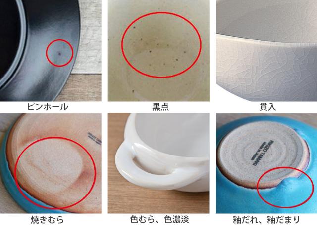 原料や製造方法により、上記のような特性がみられる場合があります。ひとつひとつのうつわの持つ個性、温かみある風合いとしてお楽しみいただければ幸いです。