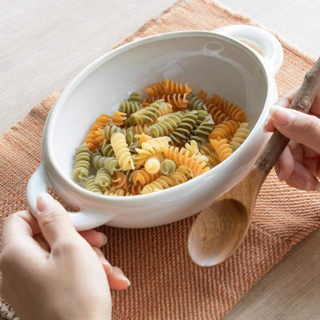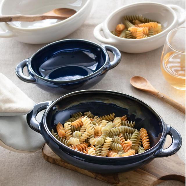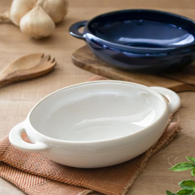 陶器製の持ち手付きグラタン皿です。グラタンやドリア、ラザニアなどをオーブン調理してそのまま食卓へ。出来立ての温かいお料理を味わえます。オーブン料理以外にも、サラダやスープ、オムライスや煮込み料理などの盛り付けに使いやすく、日々の食卓をおしゃれに底上げします。