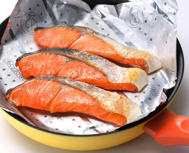 フライパン用のお料理ホイルです。厚手なので破れにくく、油をひかなくても魚をフライパンで焼くことができます。アルミホイルなので、フライパンを仕切るように使えば同時に2品作ることもでき、時短につながります。