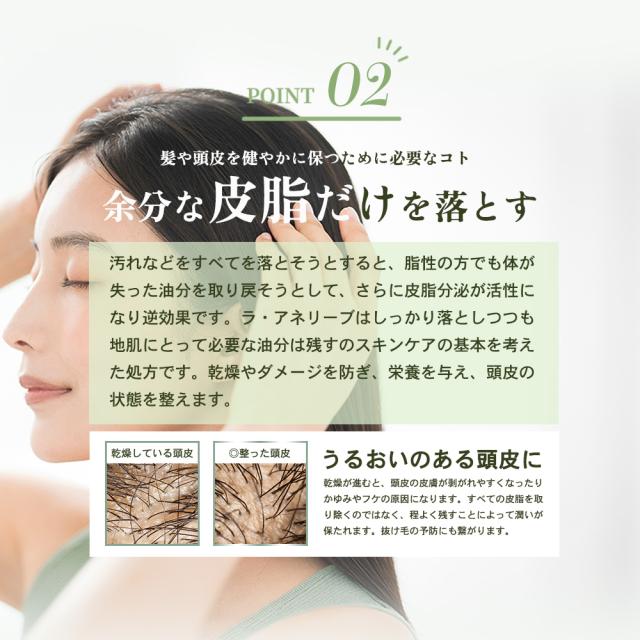 | 商品説明 | 美しい髪と美容師さんの美しい手の為のプロ用無添加シャンプーです。 強すぎるシャンプーの洗浄力は、地肌が敏感になりやすくフケ・かゆみ等トラブルの原因に! 脂性の方でも体が失った油分を取り戻そうとして、さらに皮脂分泌が活性になり逆効果です。 ラ・アネリーブは「余分な汚れや皮脂だけをしっかり落とし、地肌にとって必要な油分は残す」のスキンケアの基本を考えた処方です。 旧指定成分を含まないノンシリコンシャンプー<無香料・無着色・無鉱物油・パラベンフリー> |