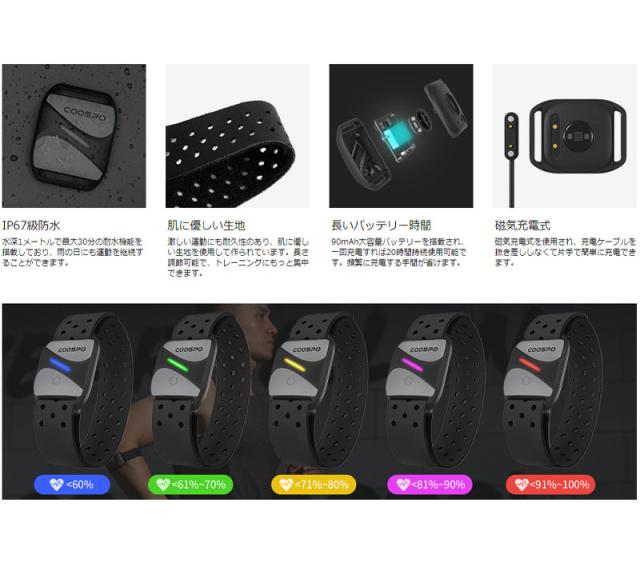 CooSpo HW807心拍計アームバンドは最新の光センサー拍数測定技術を使用して、正確性高いの心拍数データを取得できます。