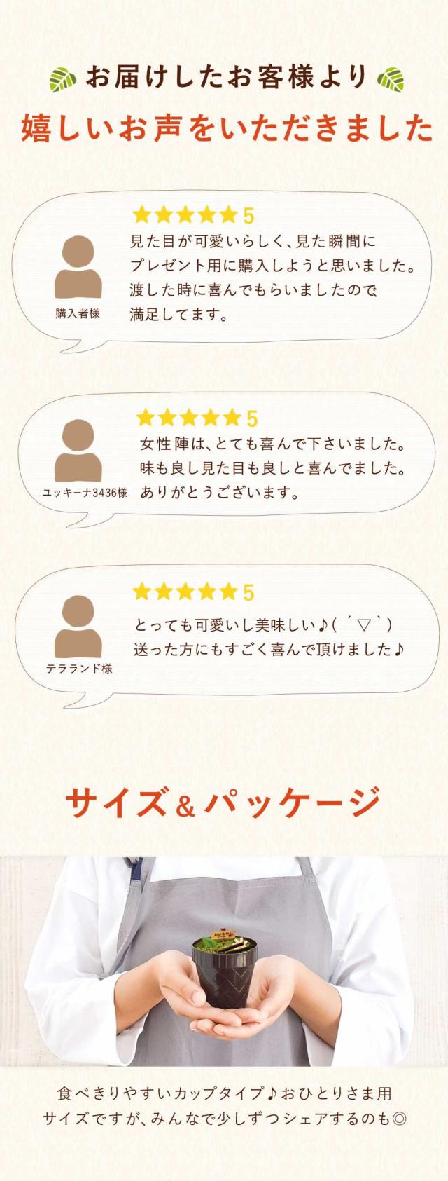 - 見た目が可愛いくてプレゼント用に購入しました。美味しかったし可愛らしくて嬉しかったと言ってもらえたので満足しています。また変わったのがあったら購入したいと思います。