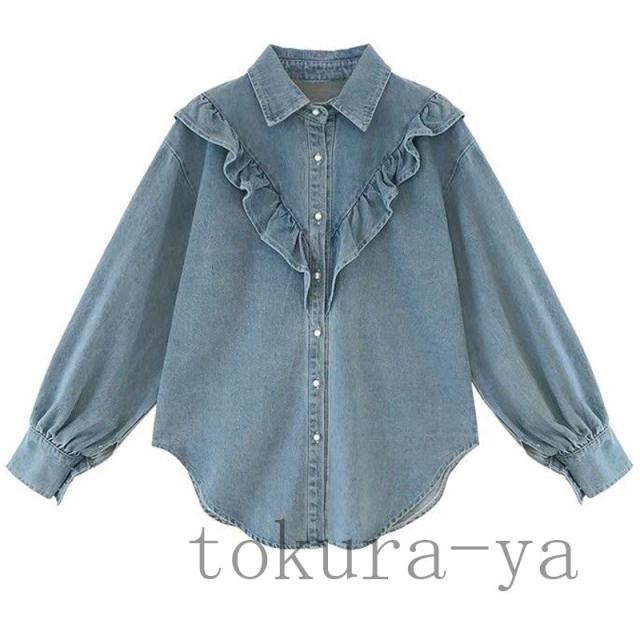 デニムシャツ ブラウス フリル 立ち襟 トップス 長袖 レディース インディゴ ヴィンテージ加工 ダンガリーシャツ 春服 上着 ゆったり 大きいサイズ