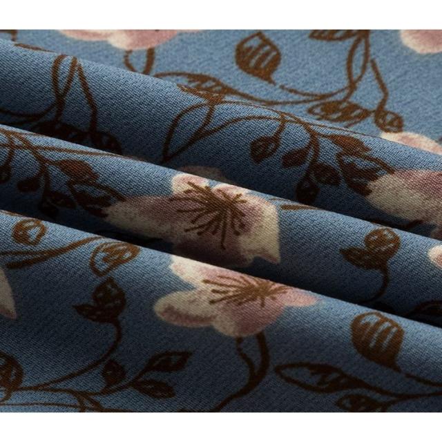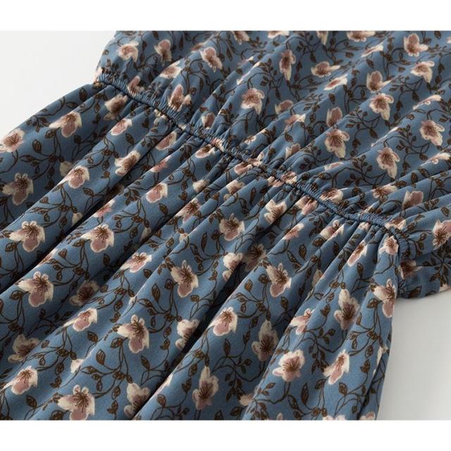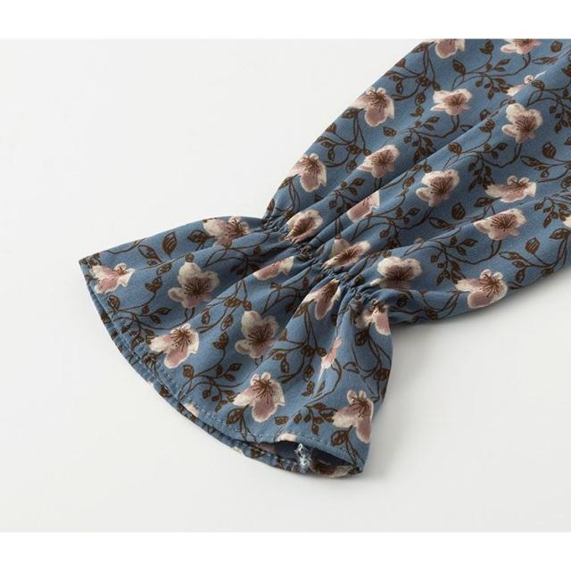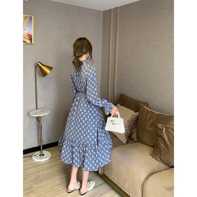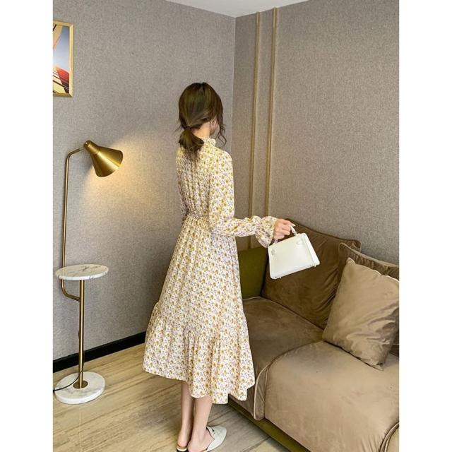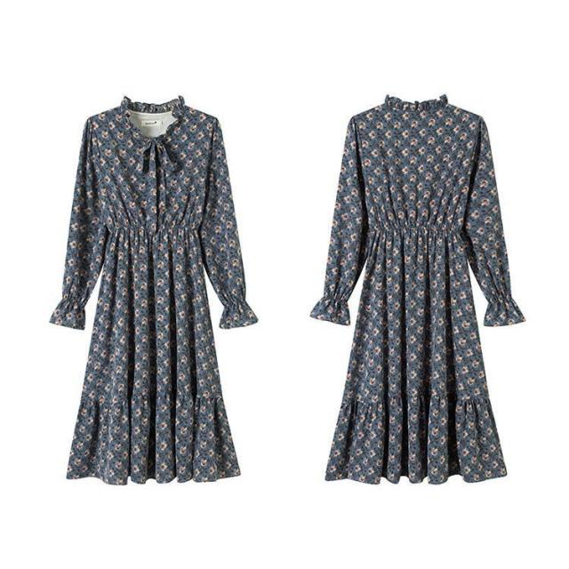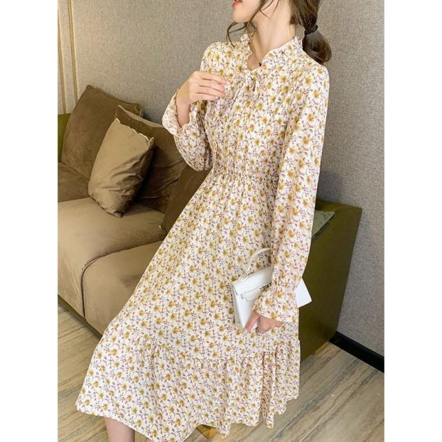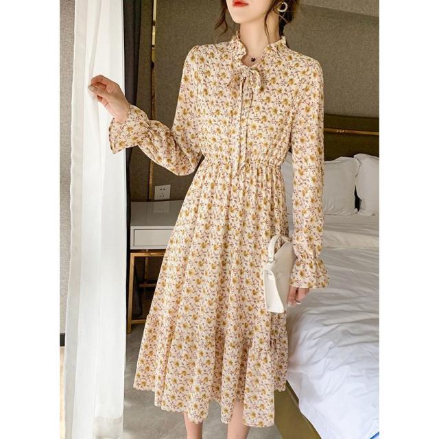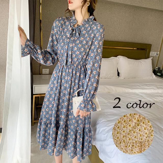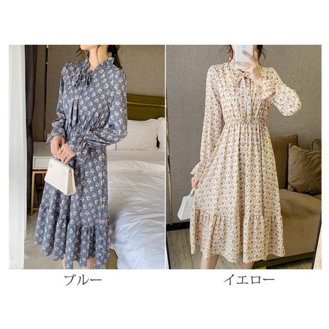 ワンピース 長袖 レディース ボウタイ ミディアム丈 ミディ丈 膝丈 シフォン 小花柄 ティアードスカート フリル スタンドカラー ラッフルカフス フ