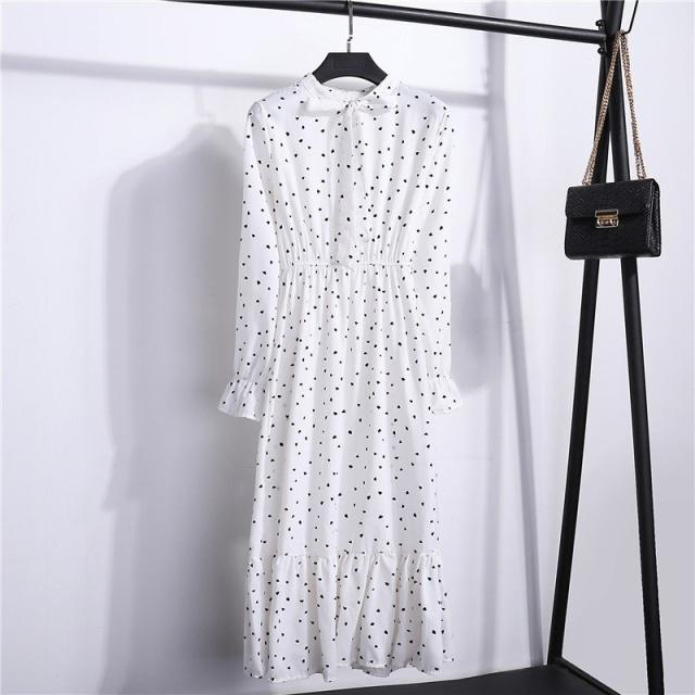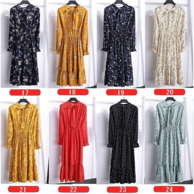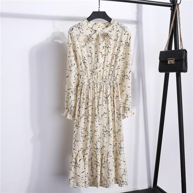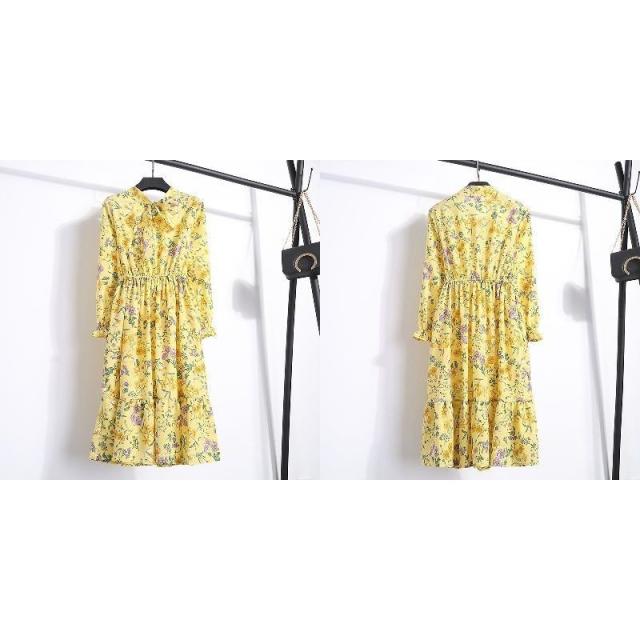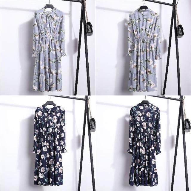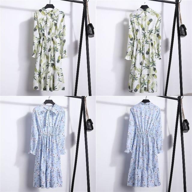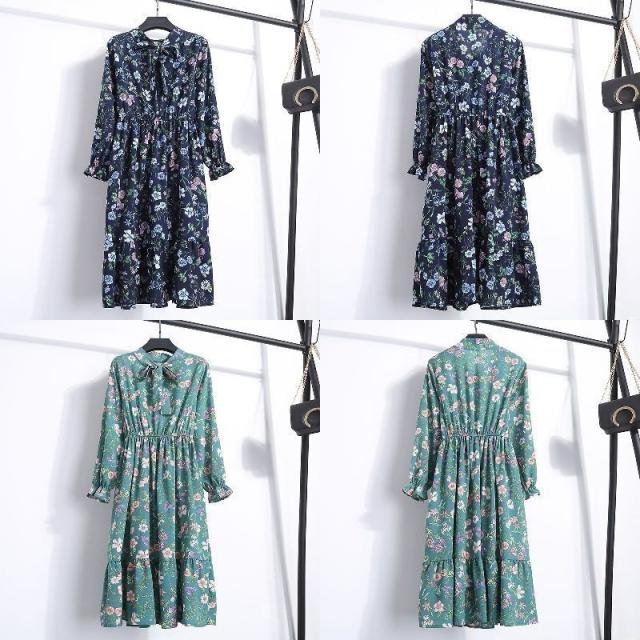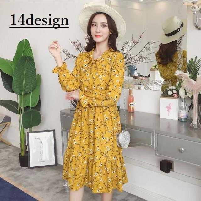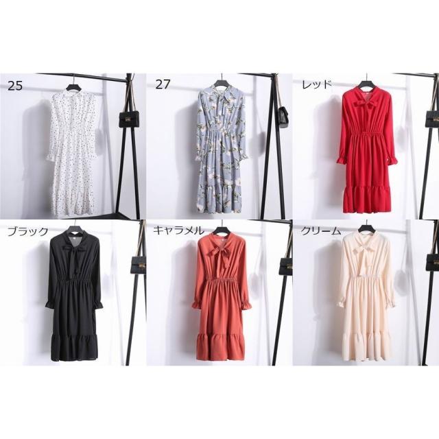 ワンピース レディース 長袖 ボウタイ リボン ミディアム ひざ丈 フレア プリーツ ウエストギャザー 袖口フリル 花柄 お嬢様 上品 お出かけ デザ