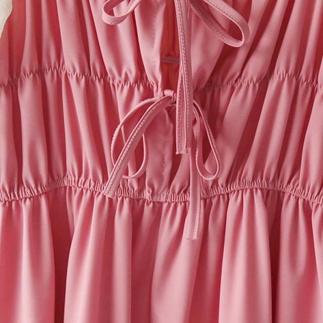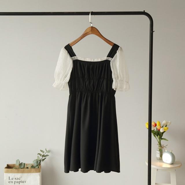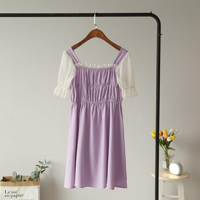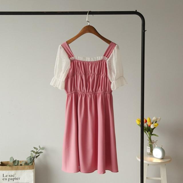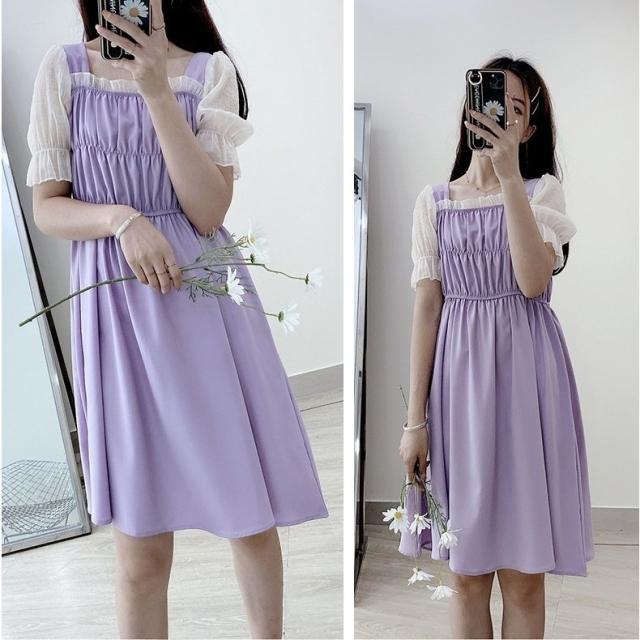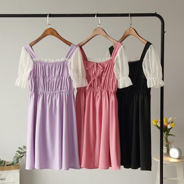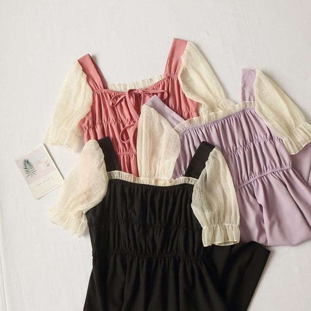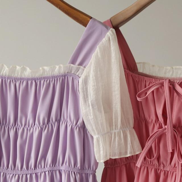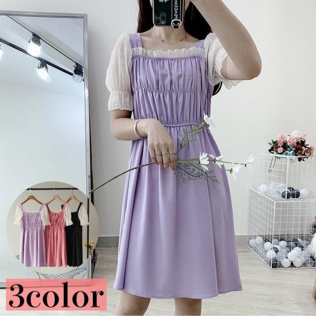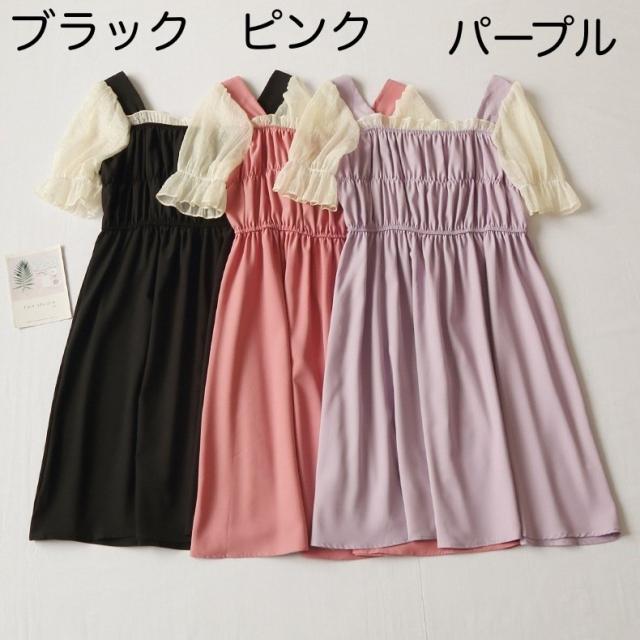 ワンピース レディース 女性 袖あり パフスリーブ スクエアネック ウエストゴム 重ね着風 ブラウス カバーオール 膝丈 ピンク パープル