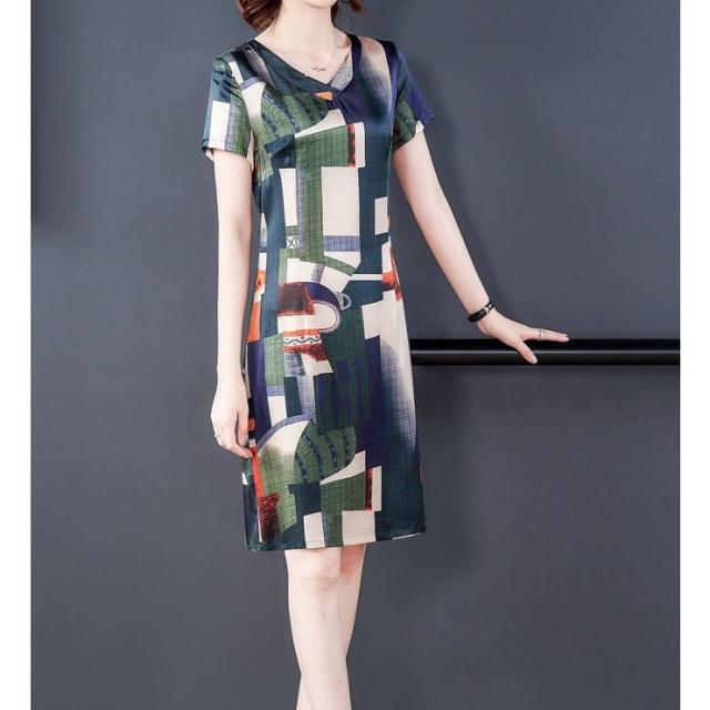 ワンピース レディース 婦人服 カジュアルドレス 半袖 Vネック 幾何学柄プリント タイト 膝丈 ミドル丈 おしゃれ レトロ風