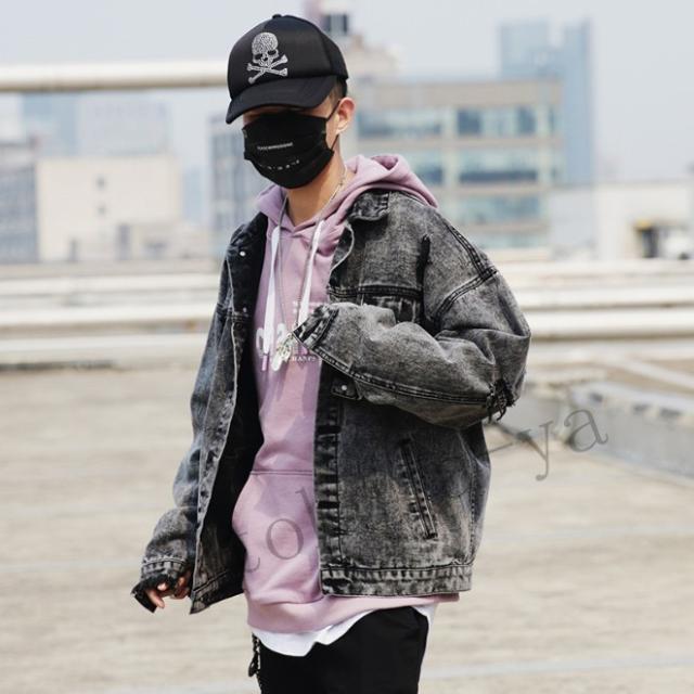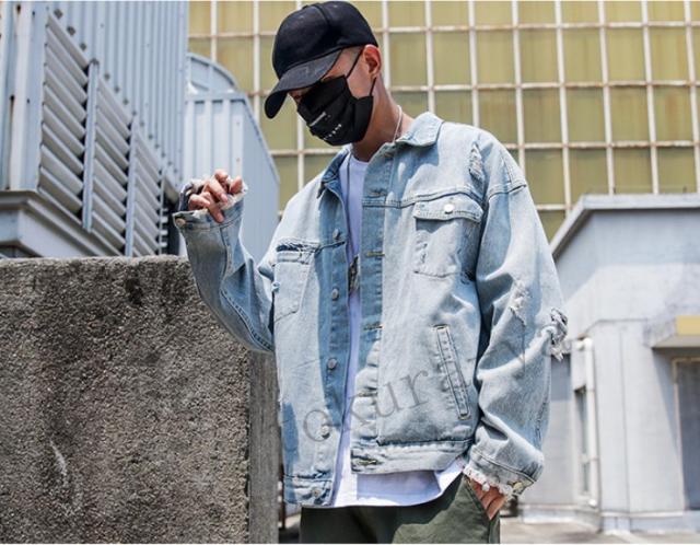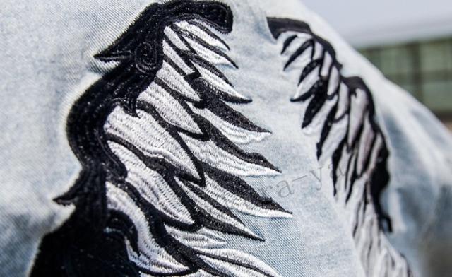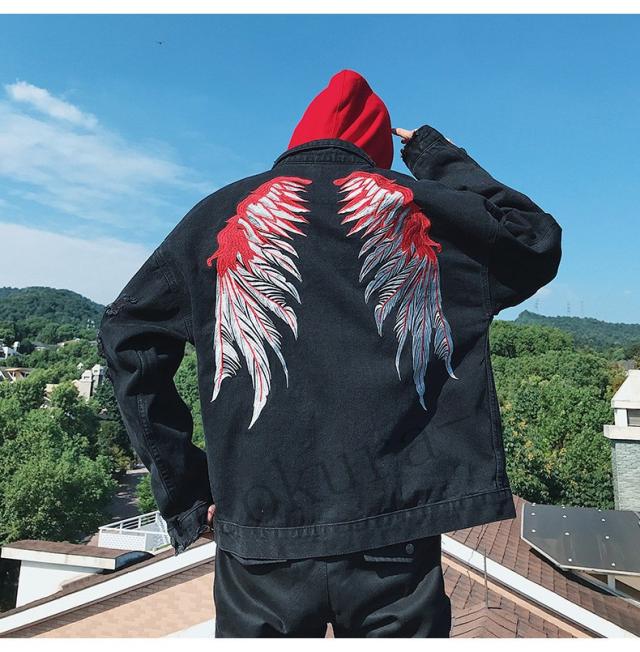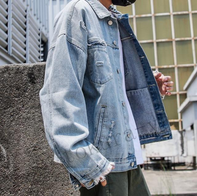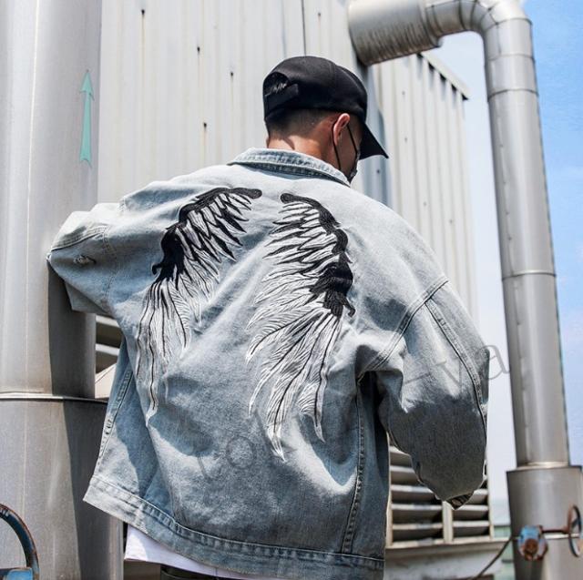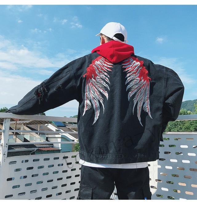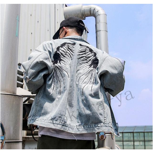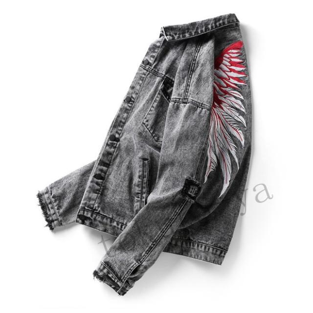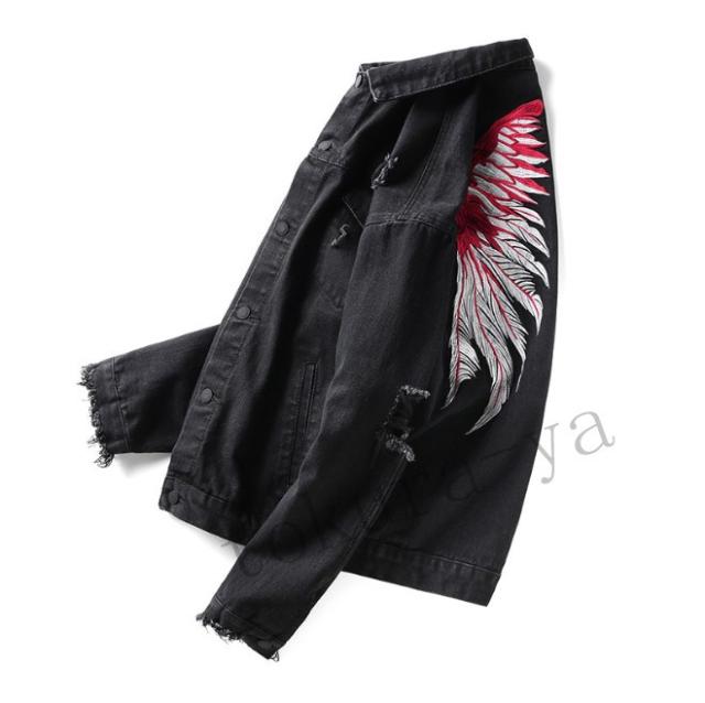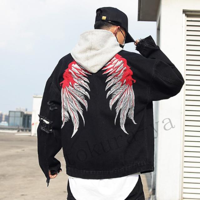 デニムジャケット メンズ 長袖 Gジャン ジージャン ショート丈 ダメージ 翼 刺繍 アウター ゆったり カジュアル 学生 ストリート 春 春物 新作