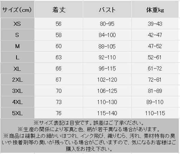 | サイズについての説明 | サイズ:/XS/S/M/L/XL/2XL/3XL/4XL/5XL |