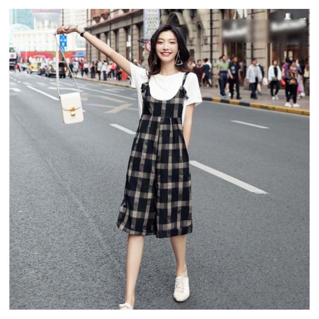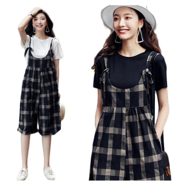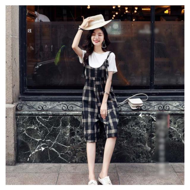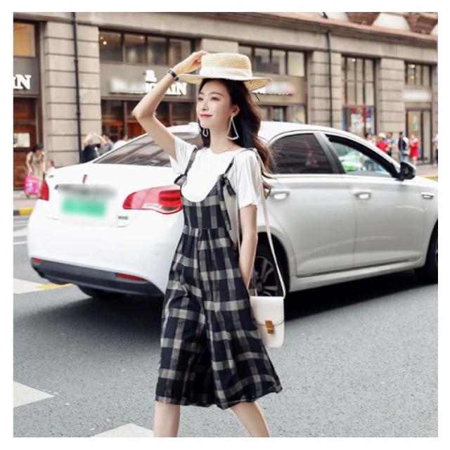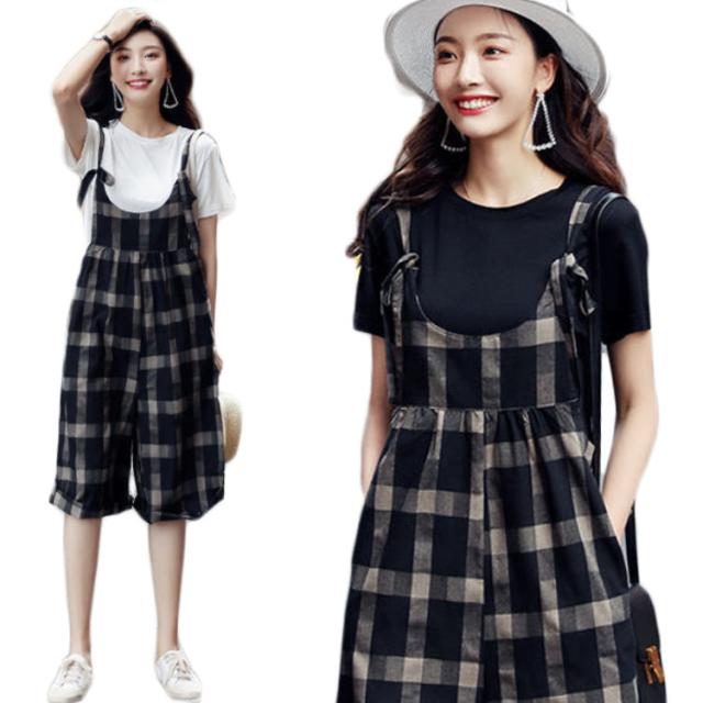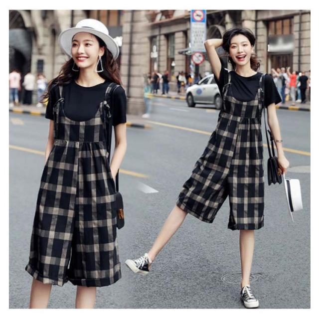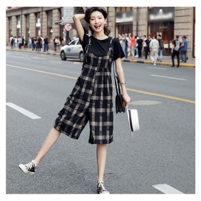 サロペットパンツ 七分丈 大人 パンツ レディース チェーク柄 夏用 二点セット 無地 膝丈 レディース シンプル カジュアル おしゃれ 送料無料 ボトムス 女性 透けない 韓国 ワイドパンツ