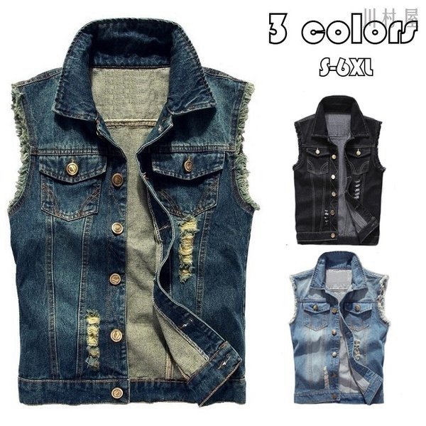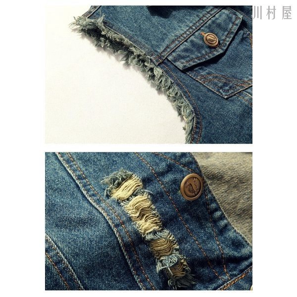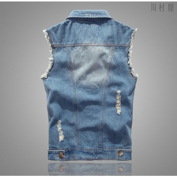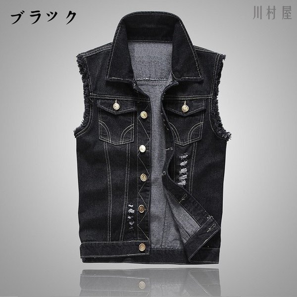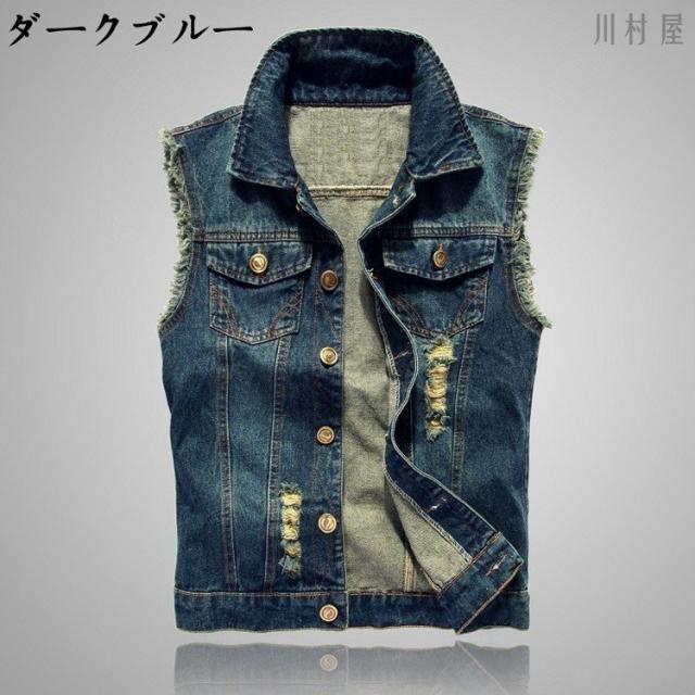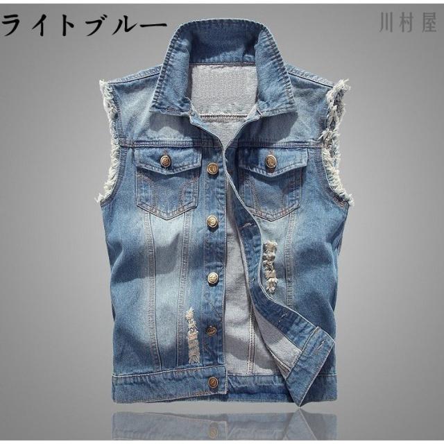 Gジャン 袖なしデニムブラウス メンズデニムベスト メンズデニムベスト チョッキ ライダースデニムアウター ダメージ加工 お兄系デニムジャケット