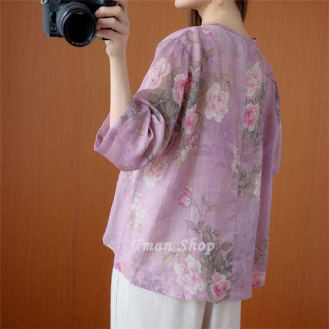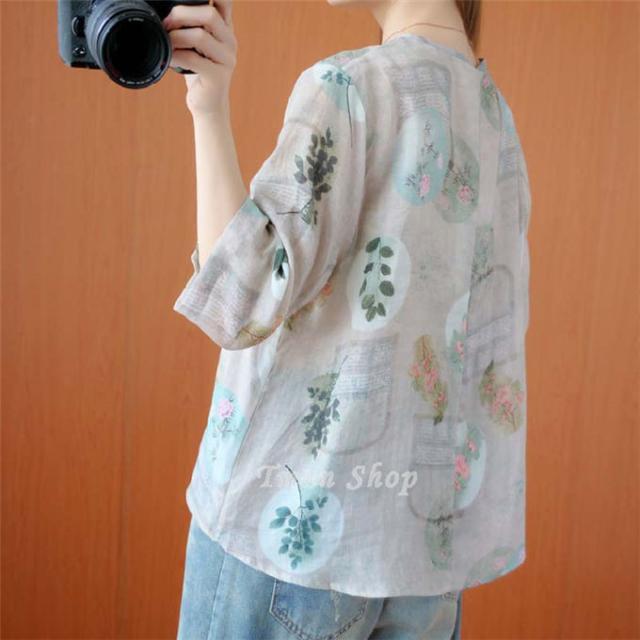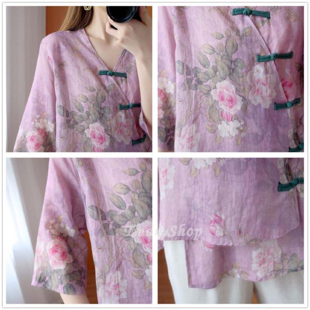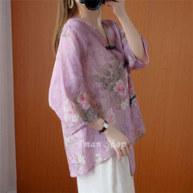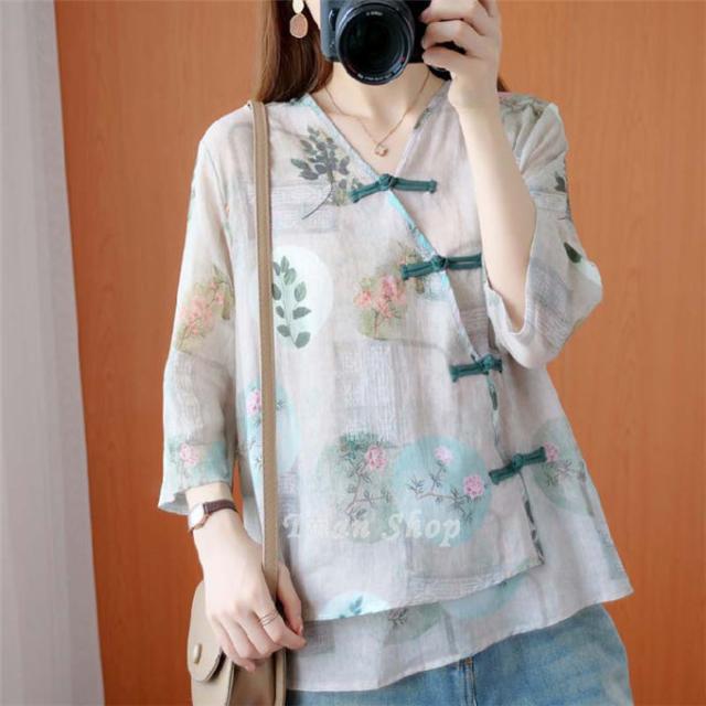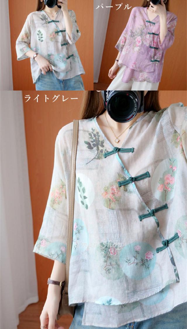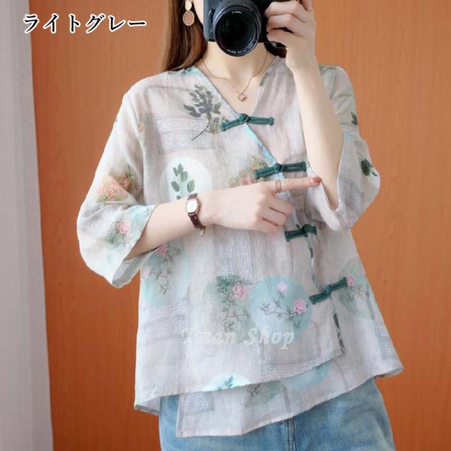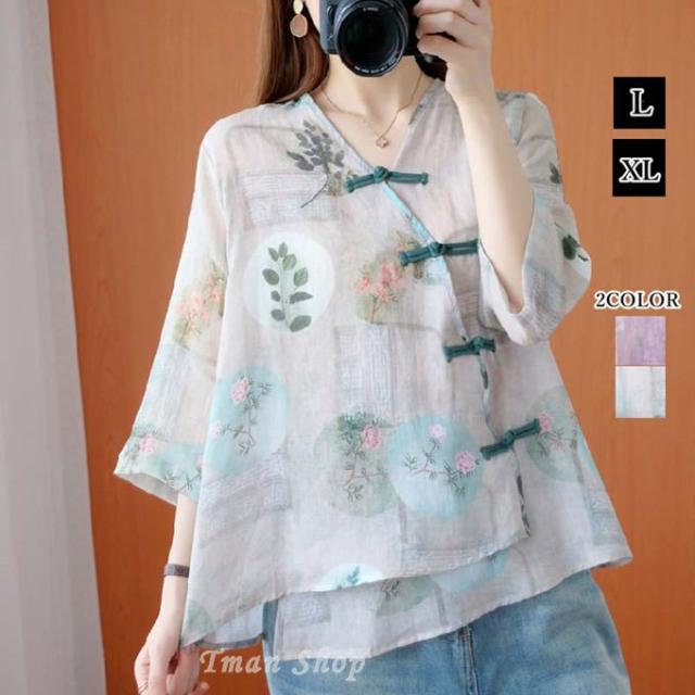 シャツブラウス Vネック トップス シャツブラウス 斜めボタン チャイナ風 プリント ゆったり 薄手 花柄 エスニック レデイース 着痩せ おしゃれ 五分袖