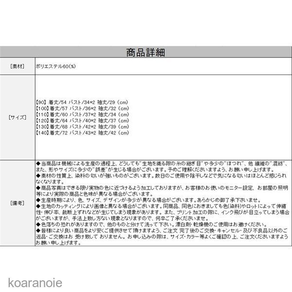 | サイズについての説明 | サイズ 【90】 着丈/54 バスト/34*2 袖丈/29 (cm) 【100】着丈/57 バスト/36*2 袖丈/32 (cm) 【110】着丈/60 バスト/37*2 袖丈/34 (cm) 【120】着丈/64 バスト/40*2 袖丈/37 (cm) 【130】着丈/68 バスト/42*2 袖丈/39 (cm) 【140】着丈/72 バスト/43*2 袖丈/42 (cm) サイズ表の実寸法は3cm程度(ニットの場合は2〜4cm程度)の誤差がある場合がございますので、予めご了承ください。 |