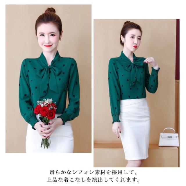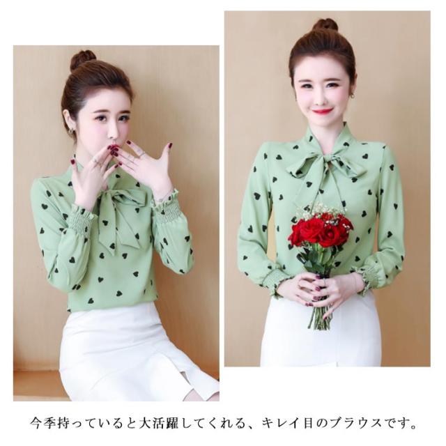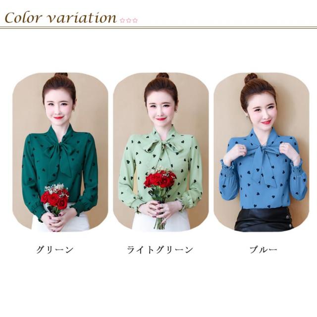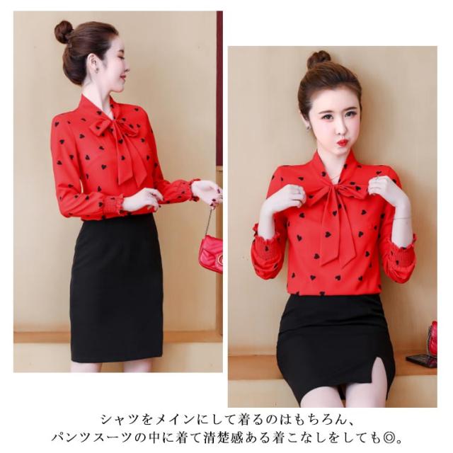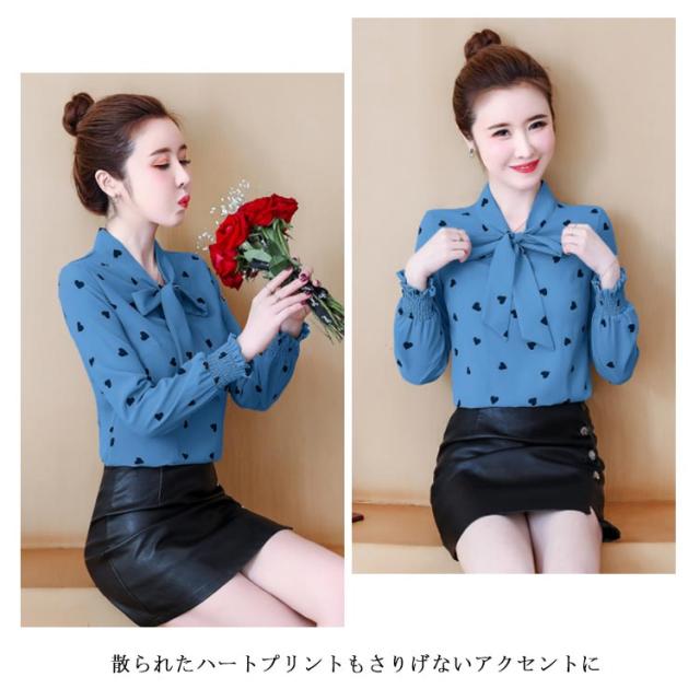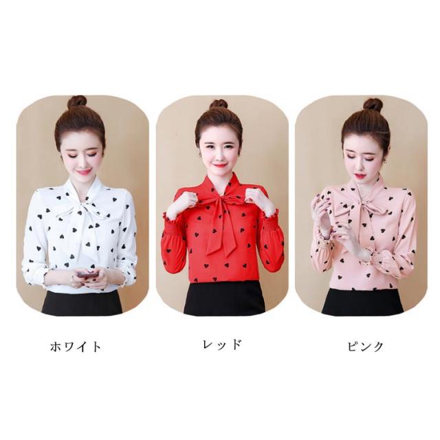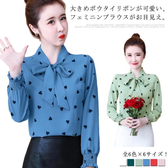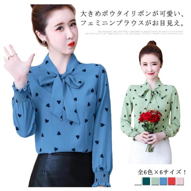 シャツ ブラウス 全6色×6サイズ!ハート柄シャツ 長袖 レディース リボンシャツ ボウタイシャツ リボン付き 長袖シャツ 大きサイズ ハート柄 春 全6色×6サイズ!ハート柄シャツ