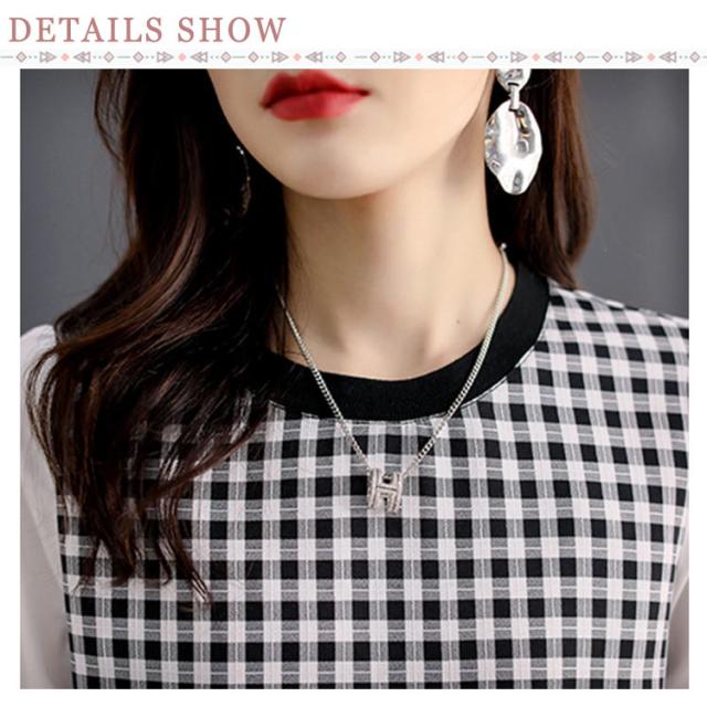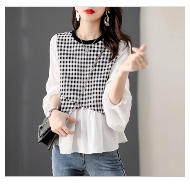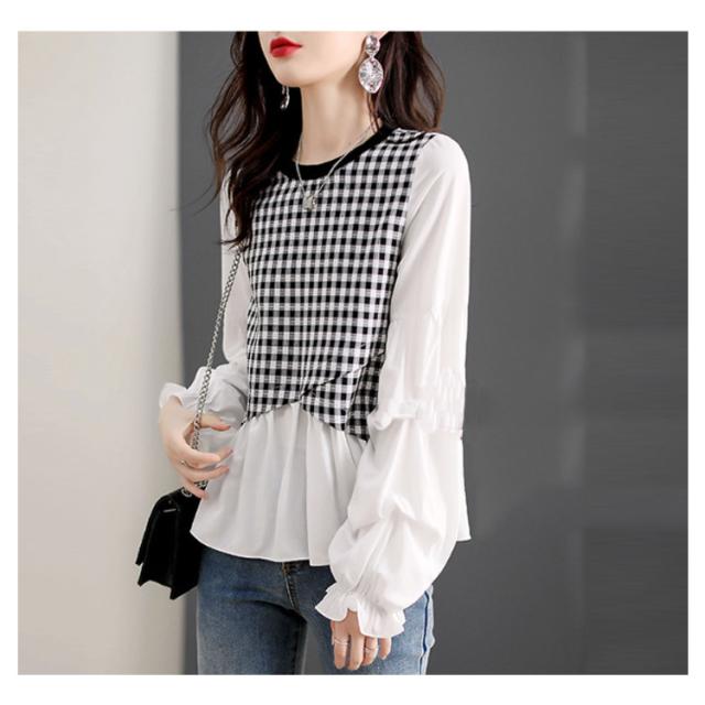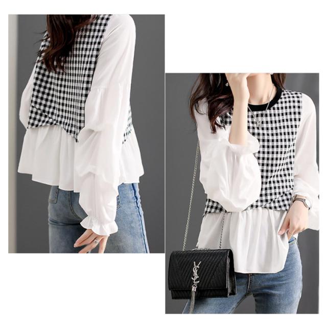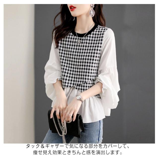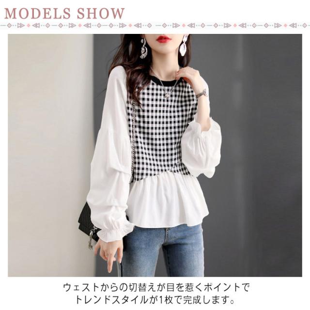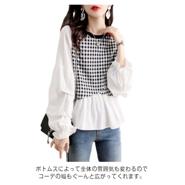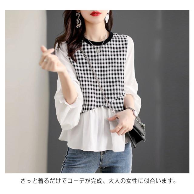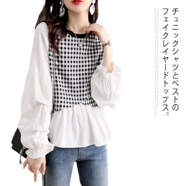 シャツ レイヤード風 ベスト 丸首 長袖 重ね着 チェック柄 ラウンドネック きれいめ ボリューム袖 バルーン袖 フェイクレイヤードチュニック プルオーバー フレア (送料無料)シャツブラウス フェミニン シンプル 通勤 (送料無料)シャツブラウス