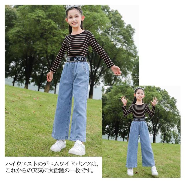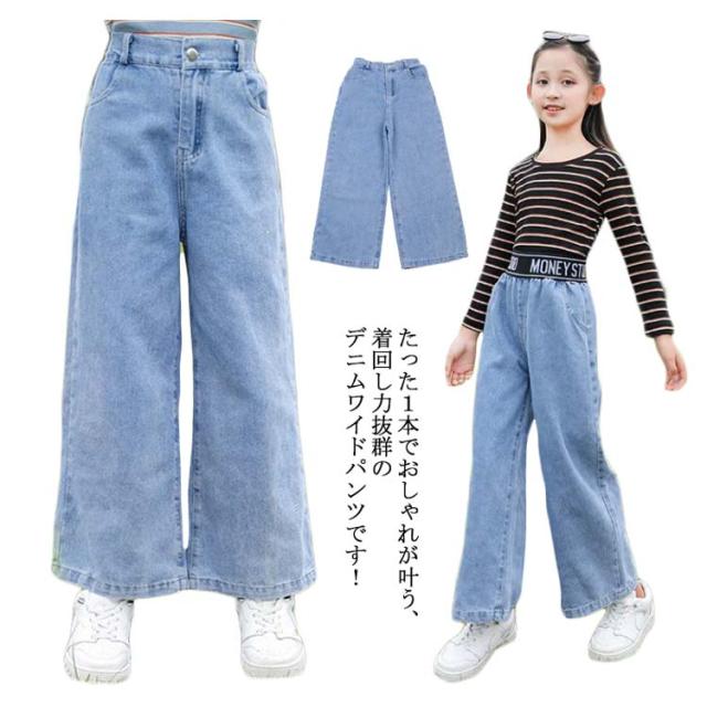 子供服 デニムパンツ ワイドパンツ 女の子 フレア デニム キッズ ダンス ゆったり ロング丈パンツ 長ズボン ボトムス ジーパン ジュニア こども 小学生 大人 着痩せ 送料無料 春秋 通勤 通学 普段着