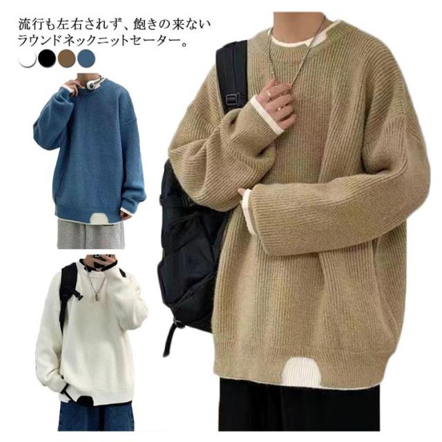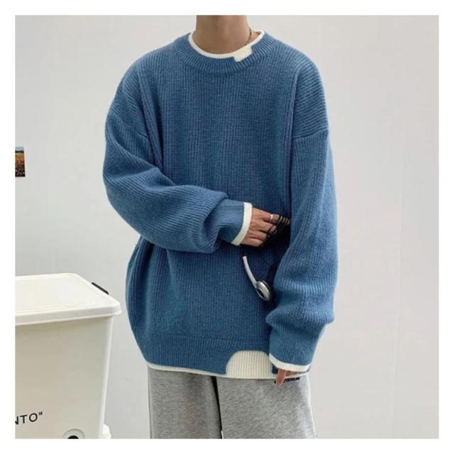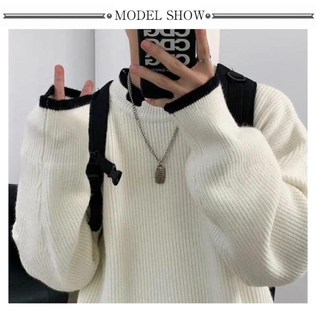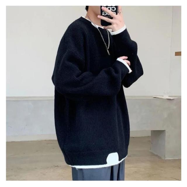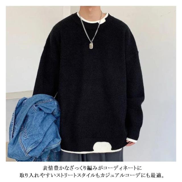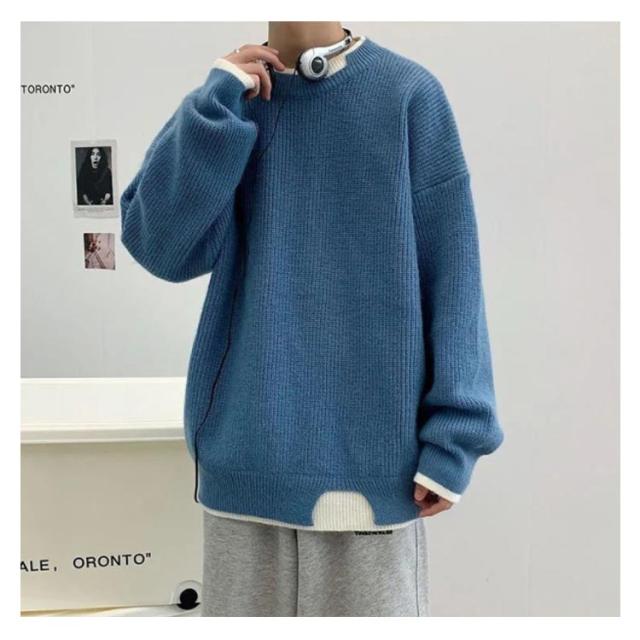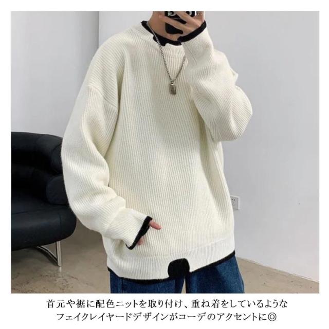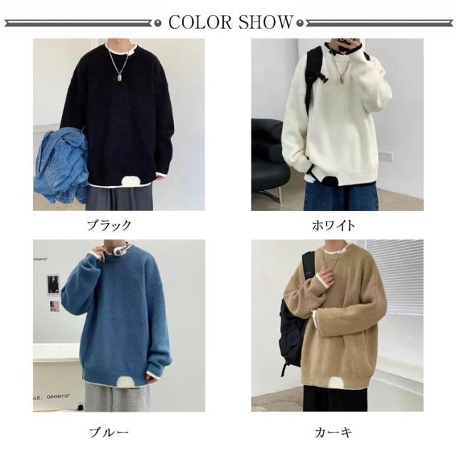 セーター メンズ フェイクレイヤード ニット オーバーサイズ ビッグサイズ ラウンドネック ニット トップス 無地 バイカラー 秋冬 ニット 重ね着風