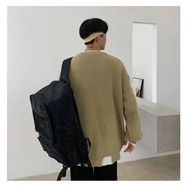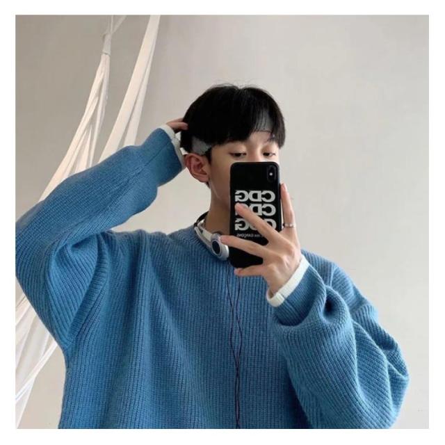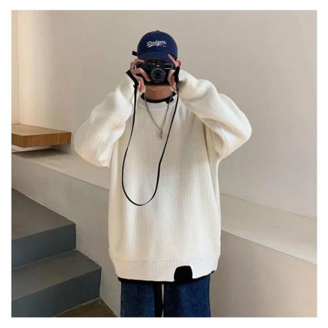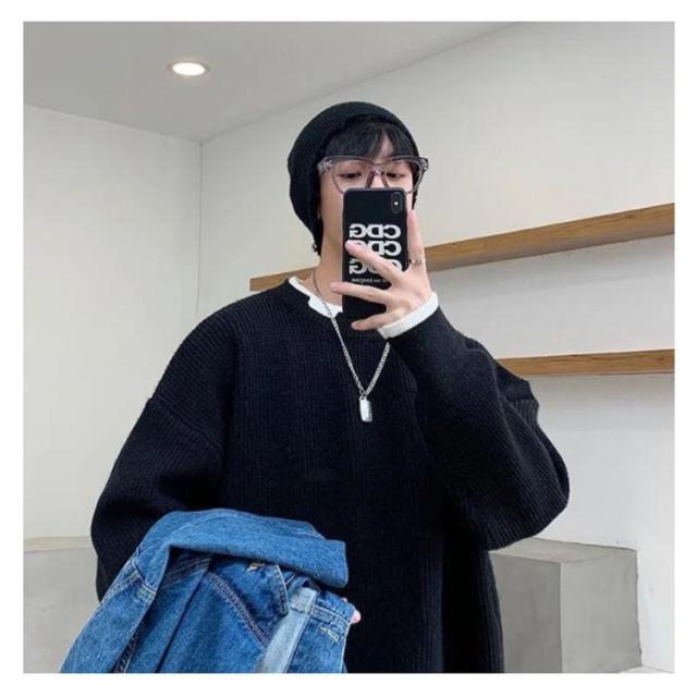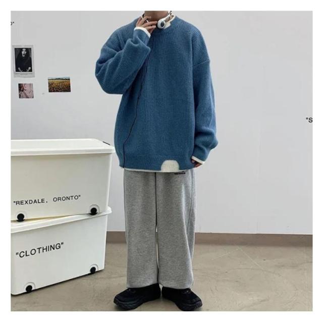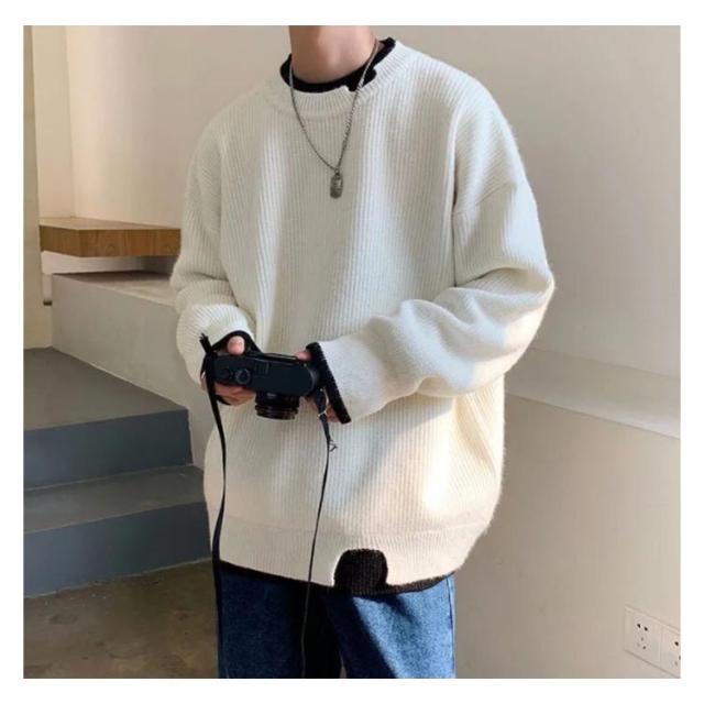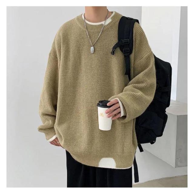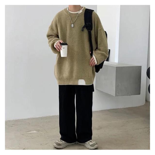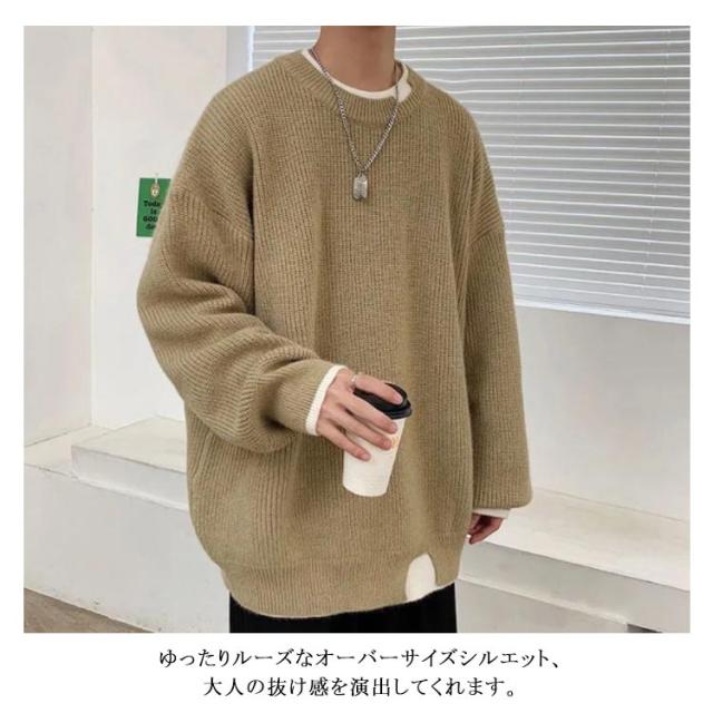 セーター メンズ フェイクレイヤード ニット オーバーサイズ ビッグサイズ ラウンドネック ニット トップス 無地 バイカラー 秋冬 ニット 重ね着風