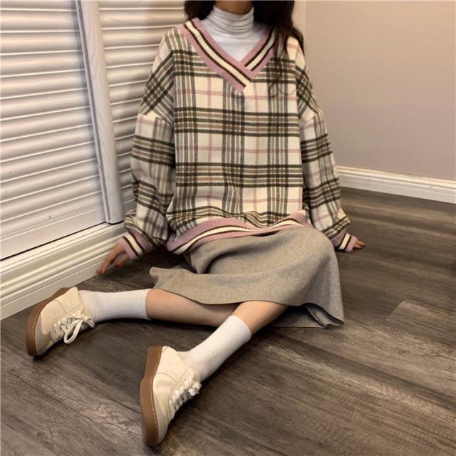 ヴィンテージ風女子学生二点セットロングスリップオーバーサイズ裏ファー秋冬スウェットパーカーグレンチェック配色切り替えVネック
