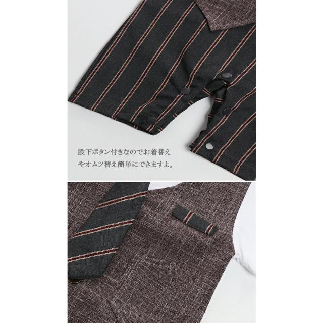 | サイズについての説明 | 紳士な男の子の雰囲気を手軽に演出◎ 股下スナップでおむつ替えも楽々。 【カラーについて】 生産ロットにより柄の出方や色の濃淡が多少異なる場合がございます。 お使いのモニターや撮影時の光の加減などにより 画像と実際の商品のカラーが若干異なる場合もございます。 |