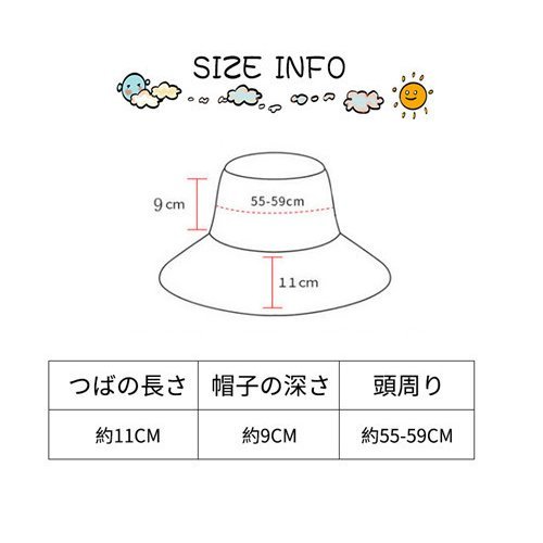 | サイズについての説明 | つばの長さ:約11cm 帽子の深さ:約9cm 頭周り:約55-59cm 注意事項: ★サイズ数字は目安です。商品により若干の誤差がございます。 ★PC、環境、光の具合等により、色のイメージが画像と若干異なる場合が御座います。 ★モデルに使用している小物やアクセサリー等はセット内容に含まれておりません。 |