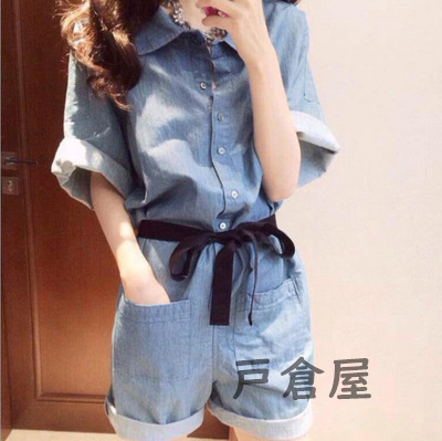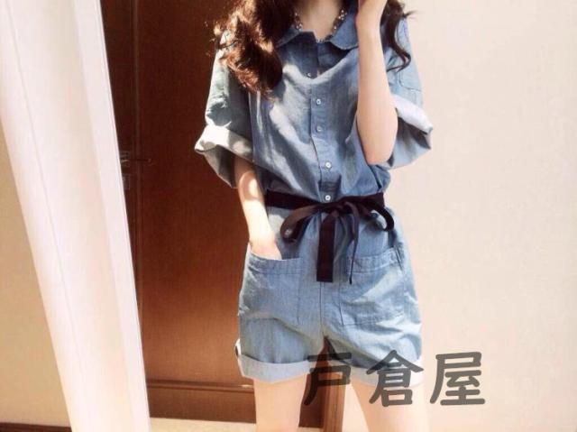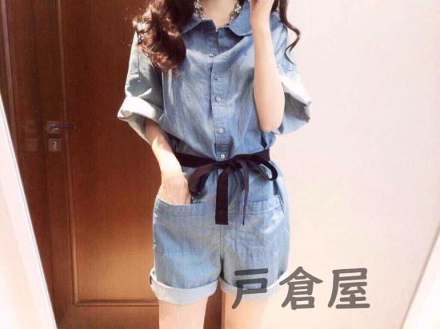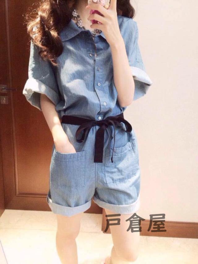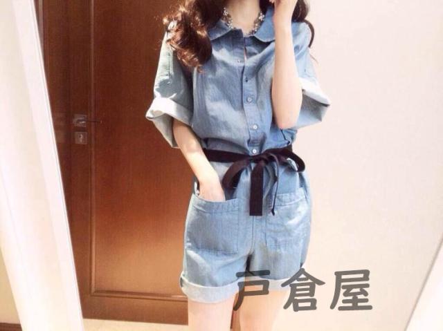 オーバーオール レディース デニムパンツ オールインワン デニム オーバーオール ショートデニム 半袖 ショート丈 折り襟 ポケット付き