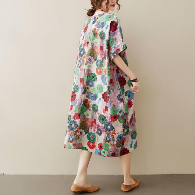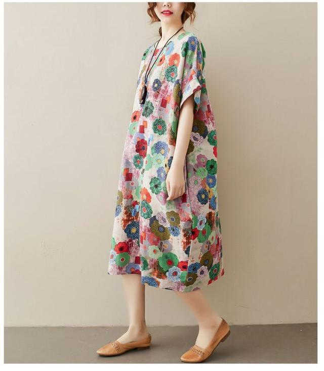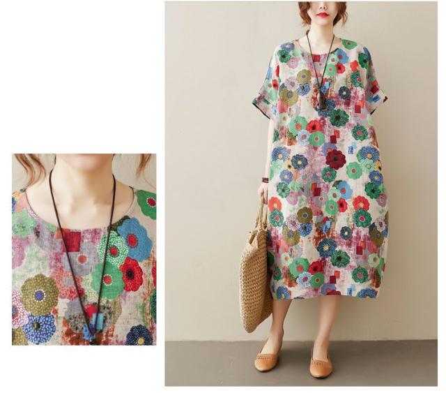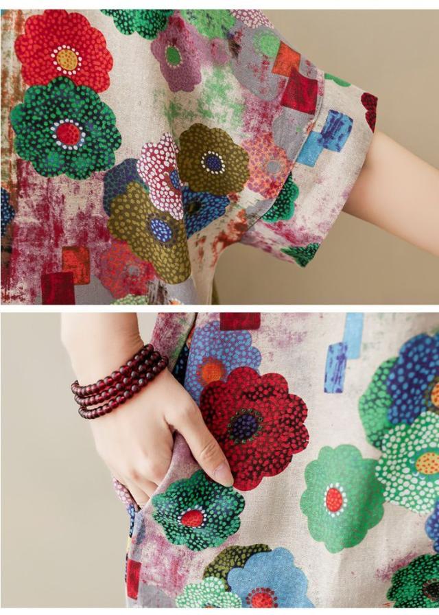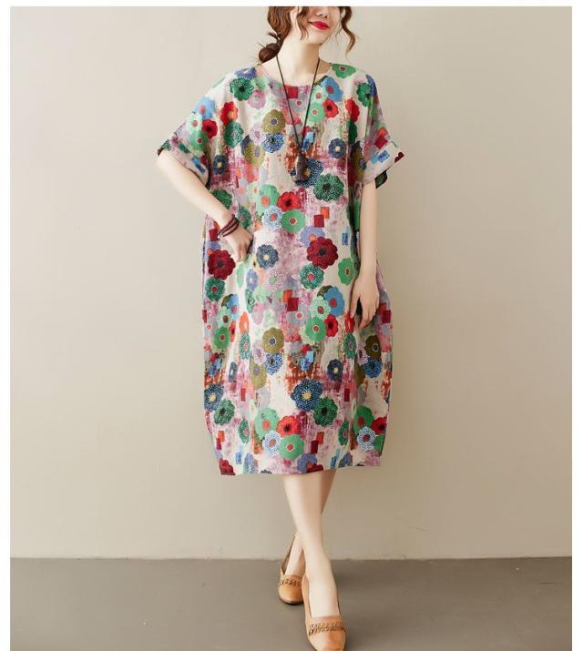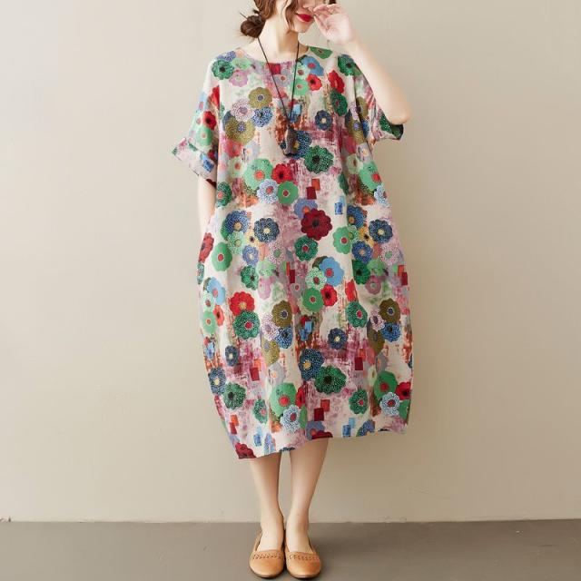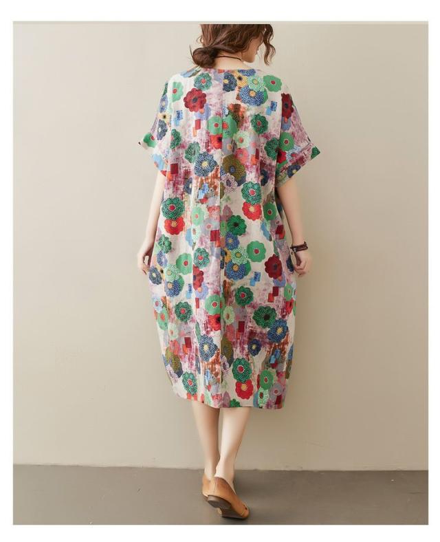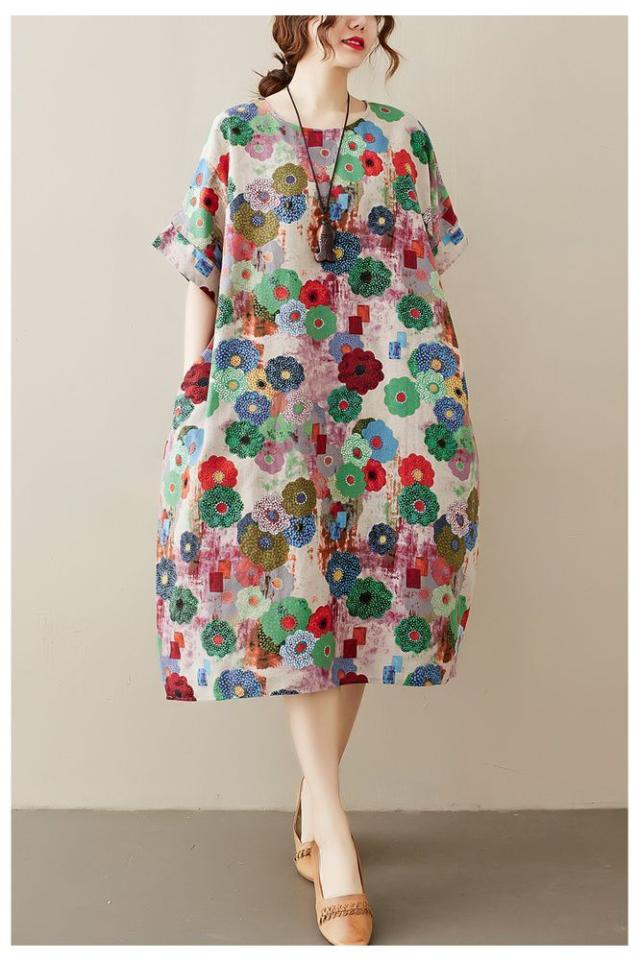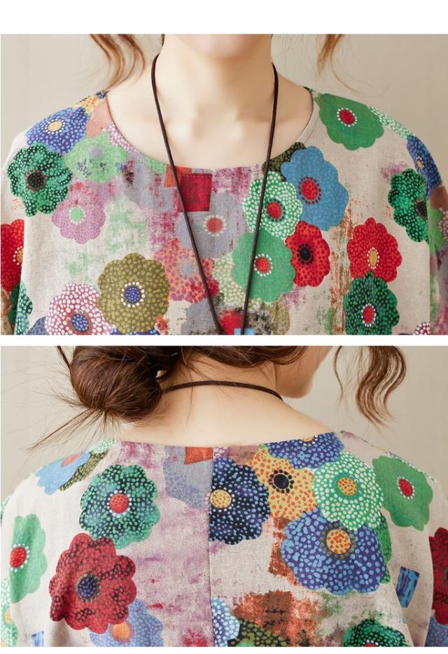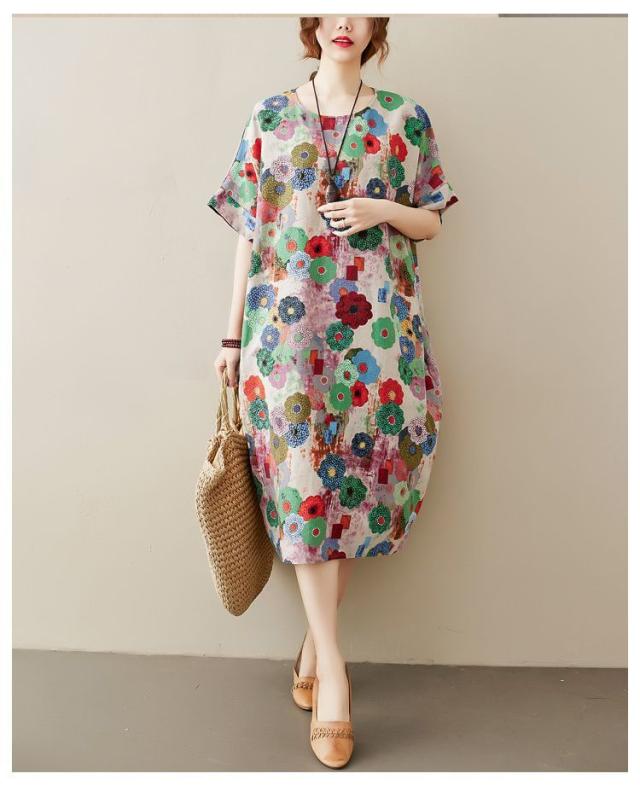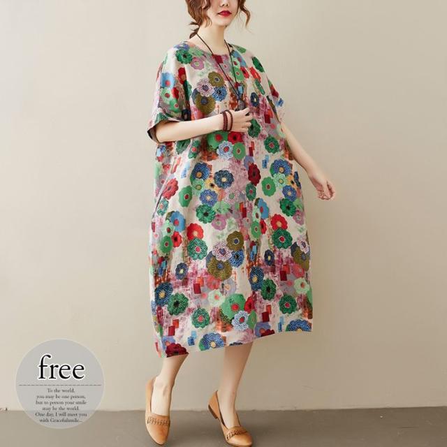 花柄 ラウンドネック 半袖 SNS映え ストリート ロング丈 ポケット ワンピース ワンピース 休日スタイル ガーリー 女子会 ママスタイル 休日