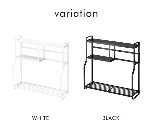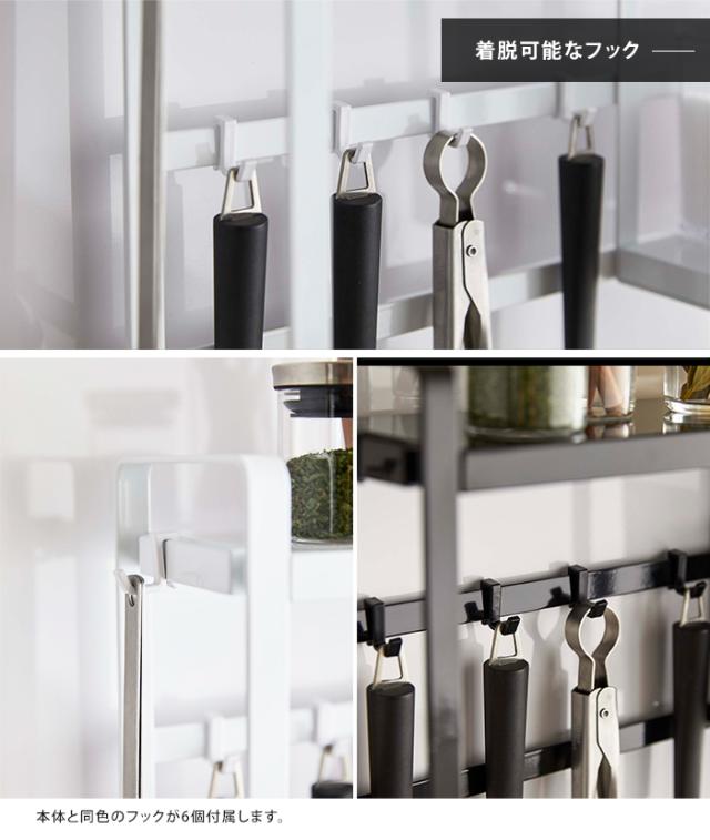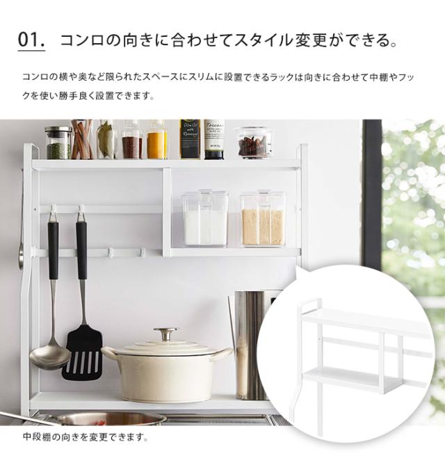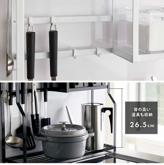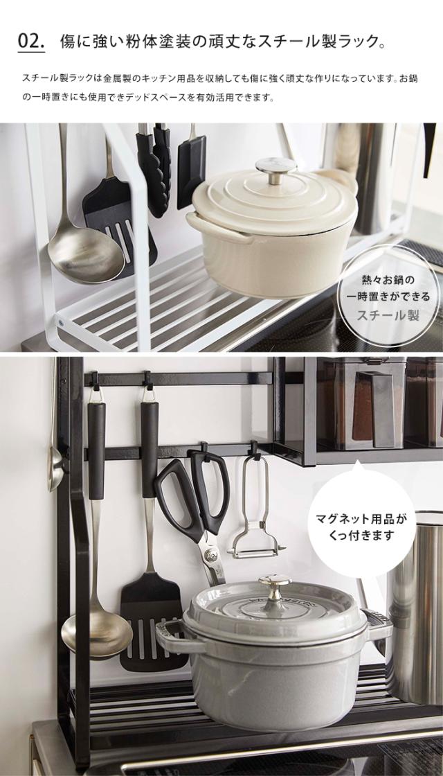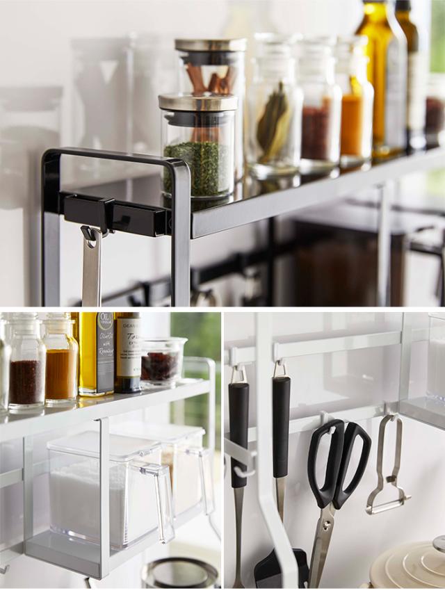コンロの横や奥など限られたスペースにスリムに設置できるラックは向きに合わせて中棚やフックを使い勝手良く設置できます。スチール製ラックは金属製のキッチン用品を収納しても傷に強く頑丈な作りになっています。お鍋の一時置きにも使用できデッドスペースを有効活用できます。