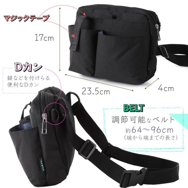 | サイズ | 幅23.5cm x 高さ17cm x 奥行き4cm ベルト調節可能 (端から端までの長さ):約64〜最長約96cm |
