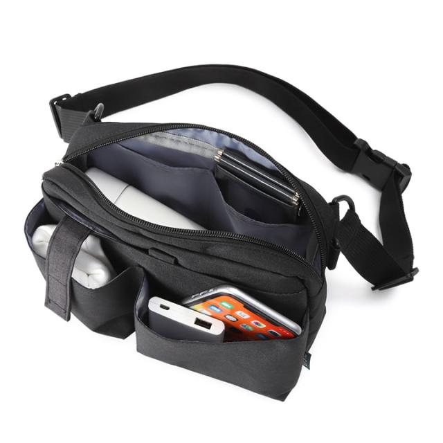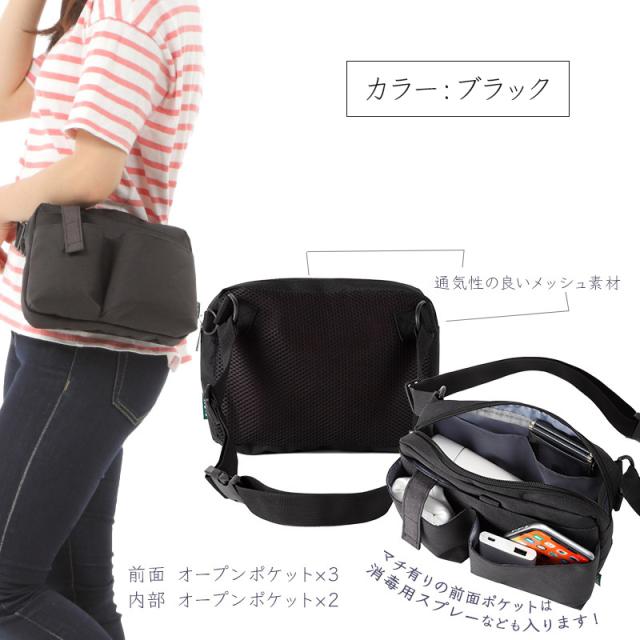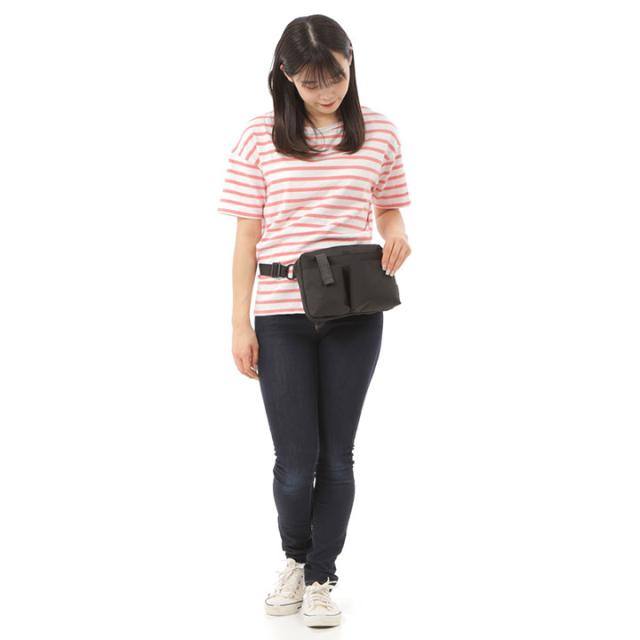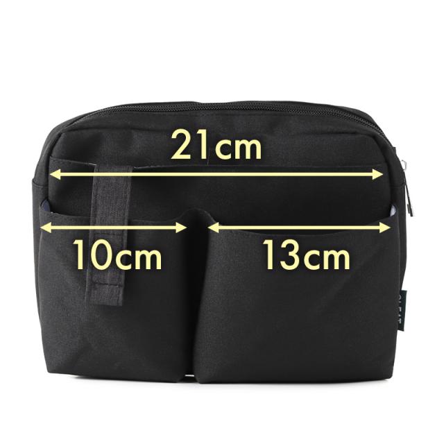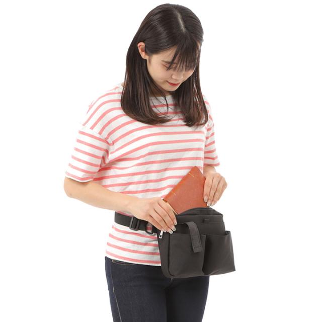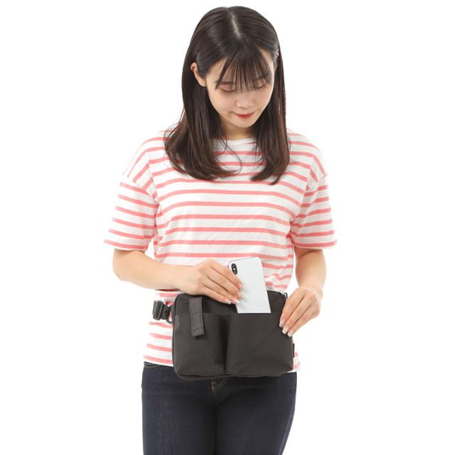 | 仕様 | ●本体前面にオープンポケット×3 (それぞれの入り口幅 21cm / 13cm / 10cm) ●本体内部にオープンポケット×2 ●サイド片側にDカン ●ウエストベルト長さ調節可能 |