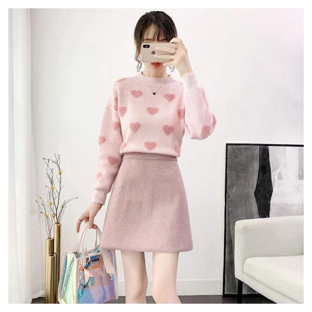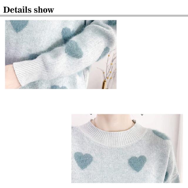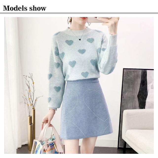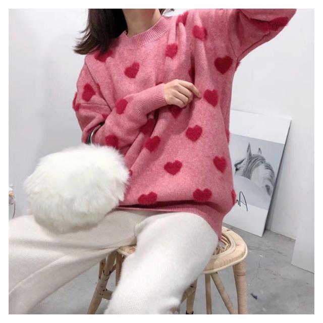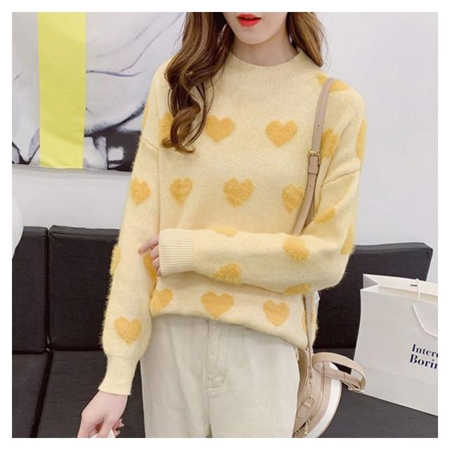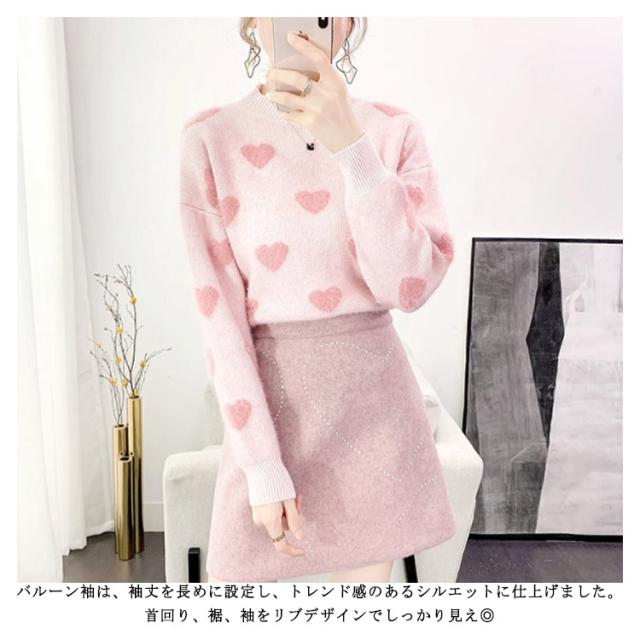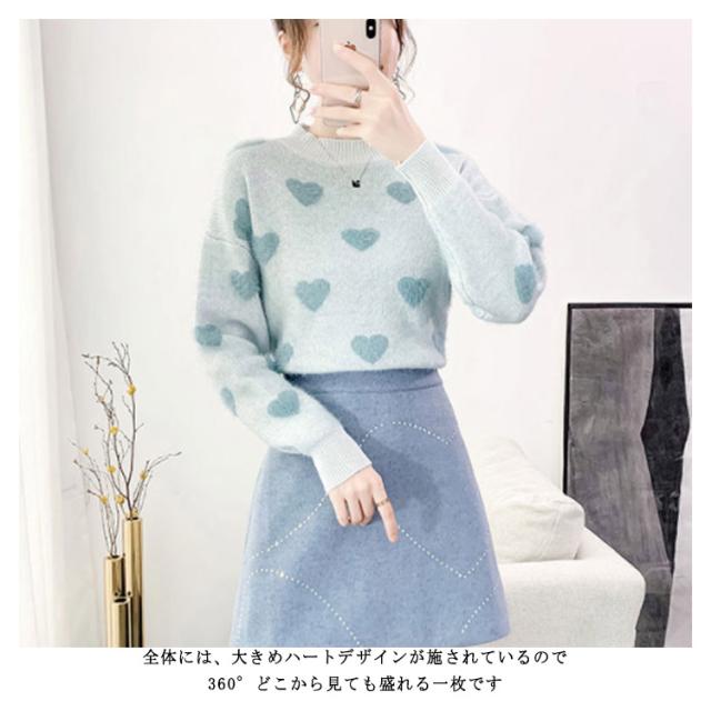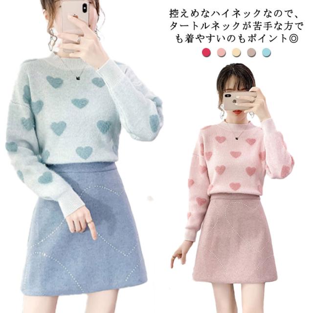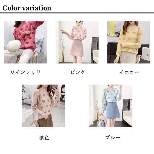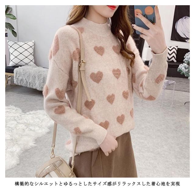 50代 ハイネック トップス 女の子 ハート柄 リブ プルオーバー ボトルネック レディース パフ袖 春 ゆったり 【送料無料】ニットセーター 秋冬 カジュアル 韓国 通学 10 20 30 40 総柄