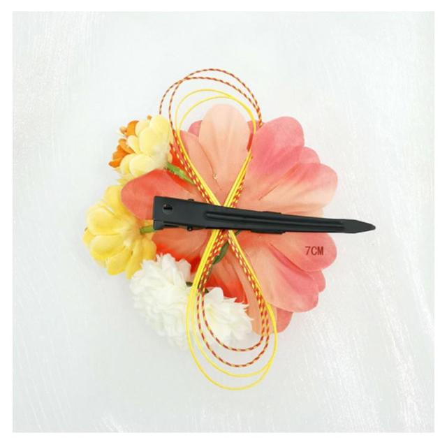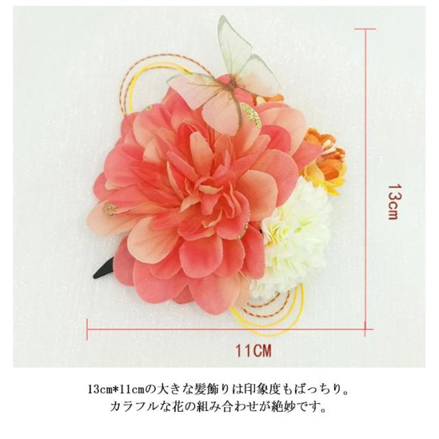 | クリップ式になっているので、ショートヘアの方でも簡単に使用できます。 簡単にアレンジヘアを華やかにしてくれるアイテムです。 13cm*11cmの大きな髪飾りは印象度もばっちり。カラフルな花の組み合わせが絶妙です。 和装(振袖・着物・浴衣・袴など)に合わせてご利用いただけます。子供から大人までたくさんのお祝いシーン(七五三、卒業式、お正月、お祭り、花火大会、成人式、結婚式)で繰り返しお使いいただけますので、大切な方への贈り物にも最適です! | |