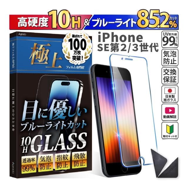 iPhone SE 3 第3世代 / SE 2 第2世代 ガラスフィルム ブルーライトカット かんたん 安心 日本製 透明ガラス 85.2%カット 保護 スマホフィルム 強化ガラス 旭硝子製 保証 アイフォン アイホン おまけ付き 防水ケース ポイント消化 送料無料