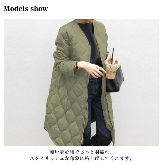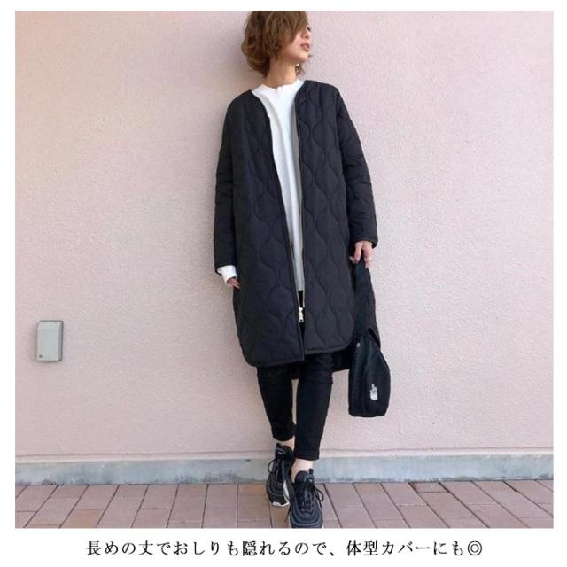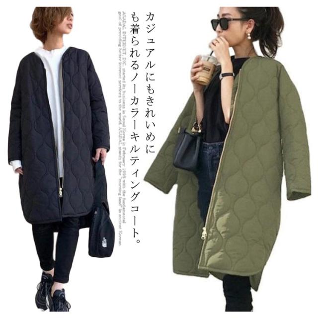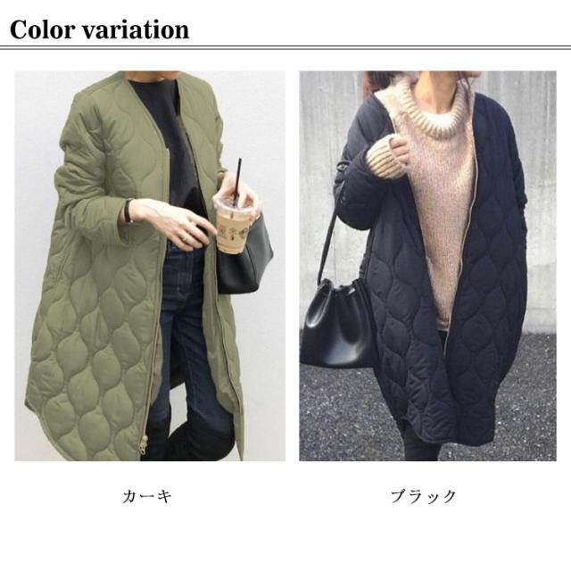 シンプル 黒 秋 レディース ロングコート ミリタリージャケット 防寒 ジャケット ゆったり アウター 秋冬 中綿ジャケット キルティングコート 暖かい ジップアップ 冬 羽織り ミリタリー カジュアル ノーカラー