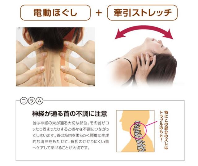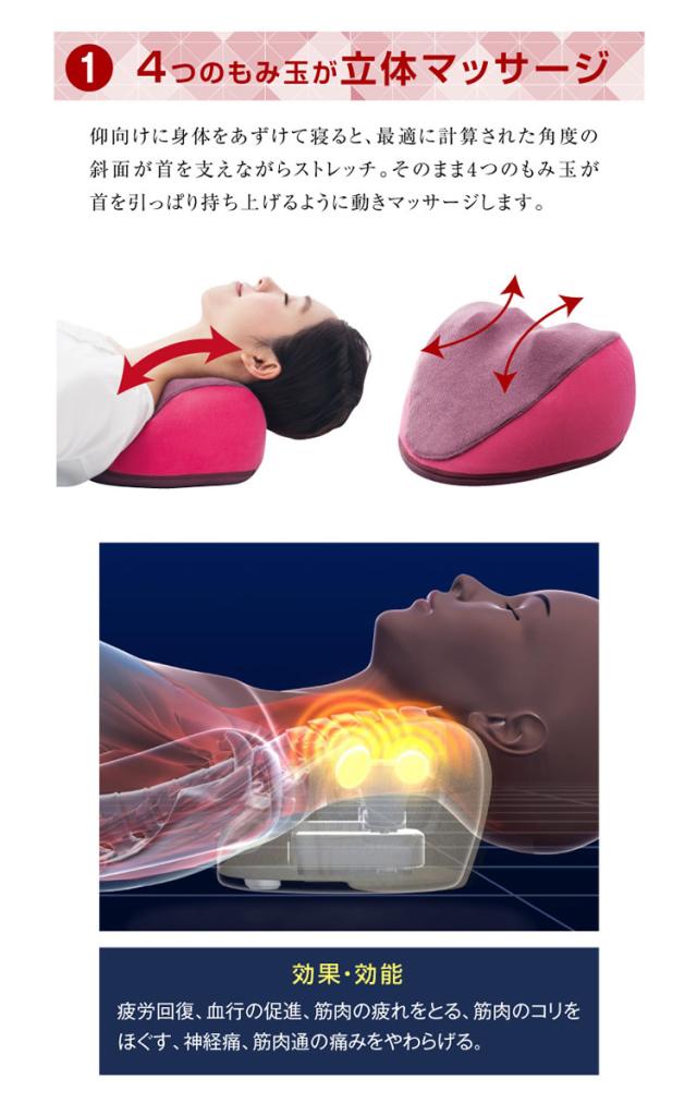 寝るだけでしっかり首をストレッチしながら、コリほぐしを実現した新方式「首のストレッチ+揉み玉構造」時間と場所を選ばない、コンパクトサイズのマッサージ機器です。