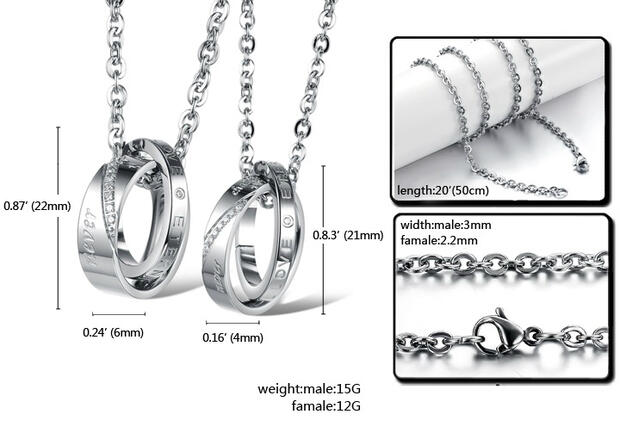 サージカルステンレス316L製 永遠の愛 ジルコニア LOVE 2連リング ペアネックレス