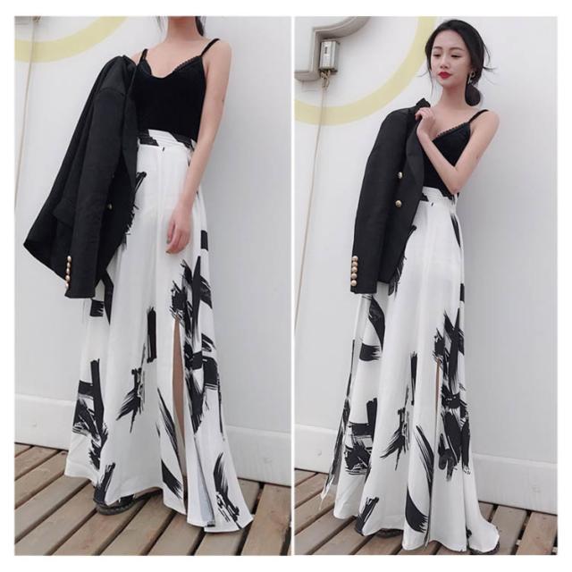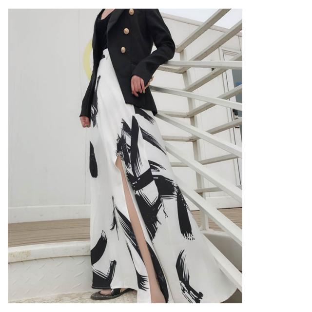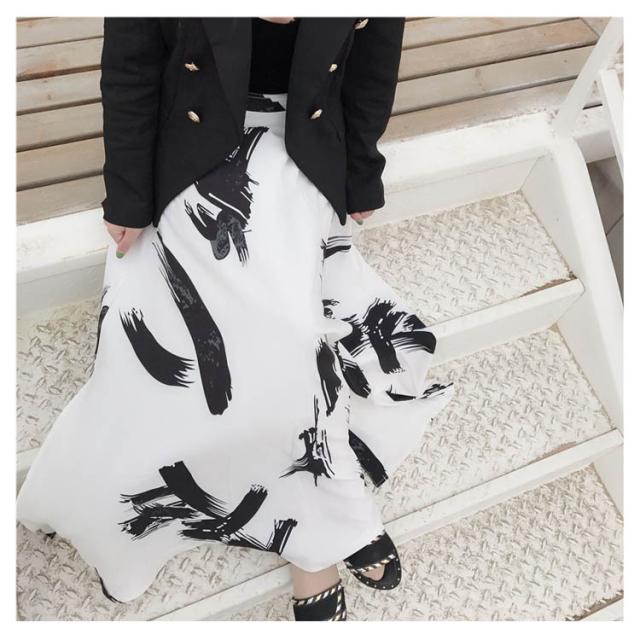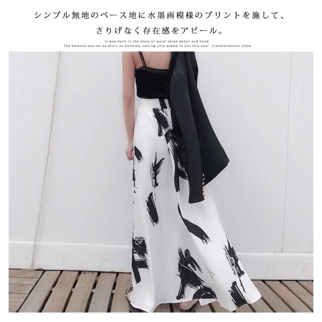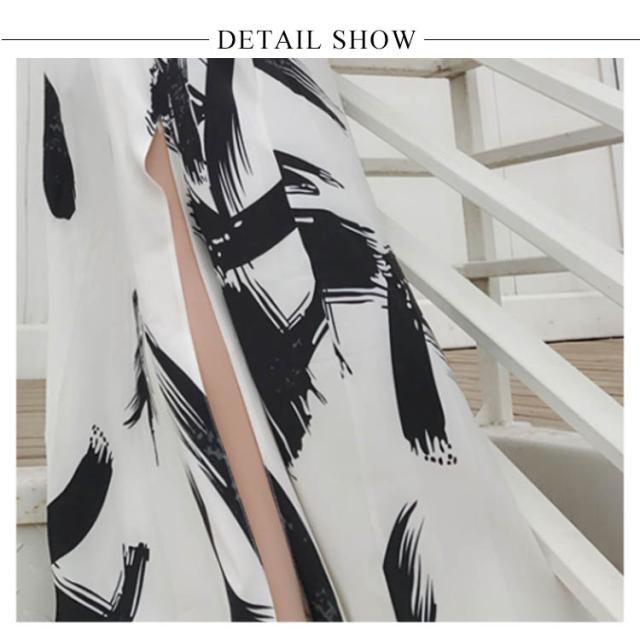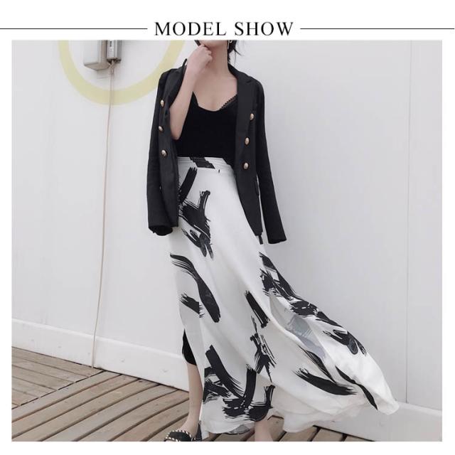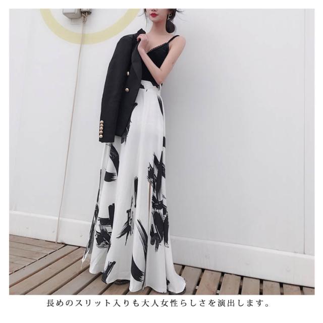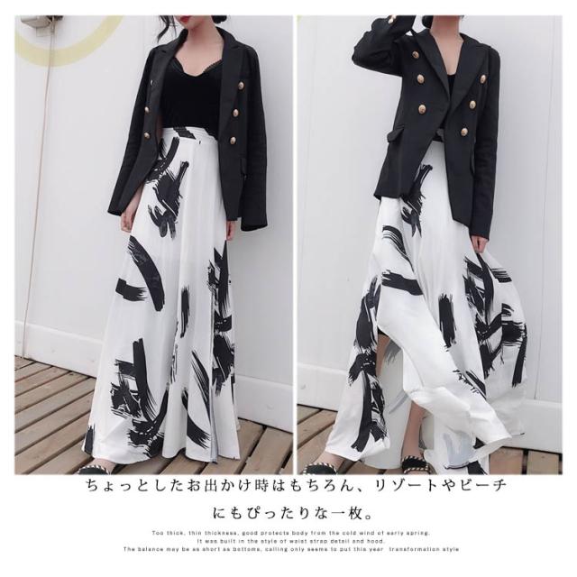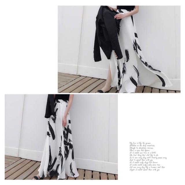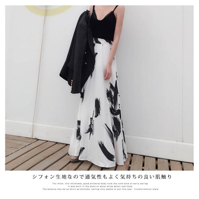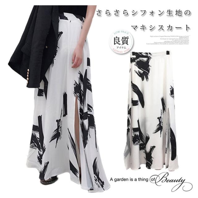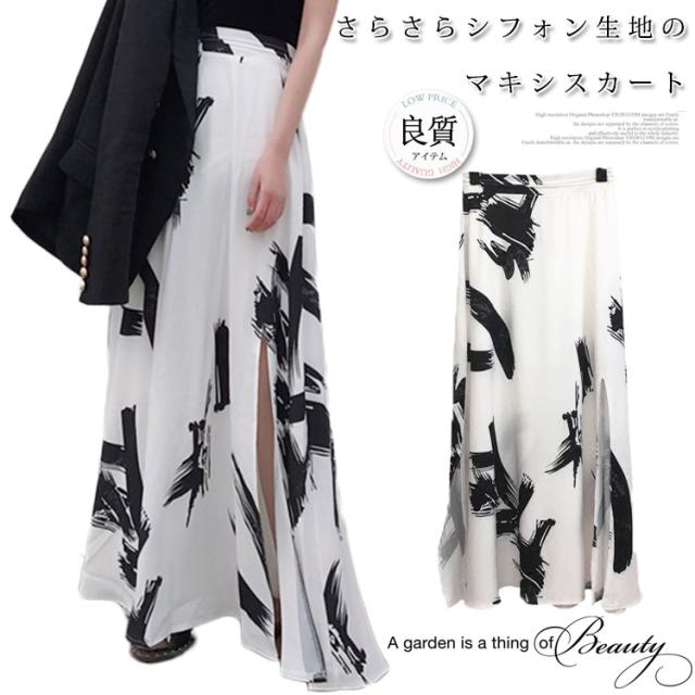 マキシシフォンスカート 水墨画柄 プリント 夏 スカート シフォン マキシ丈