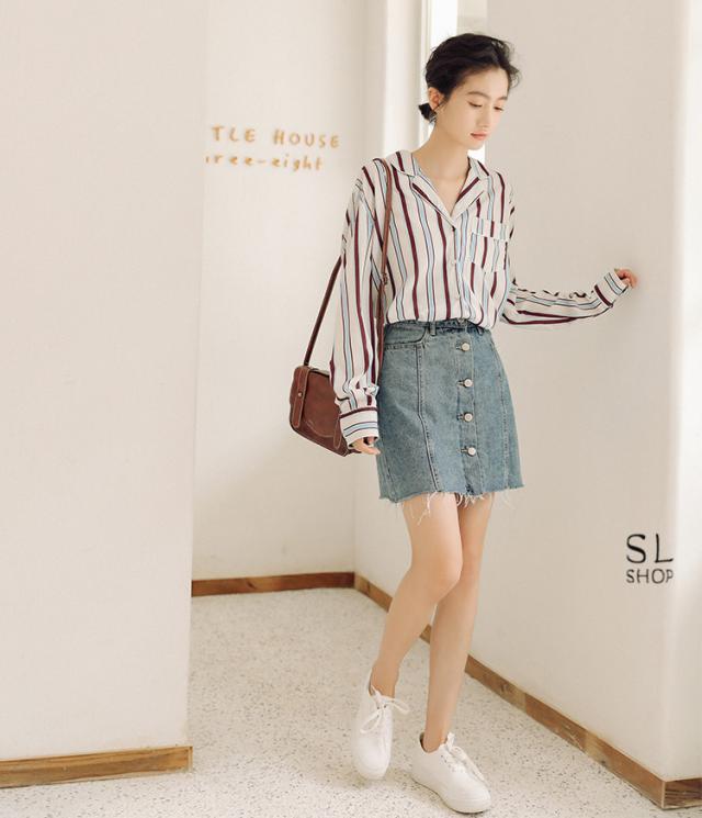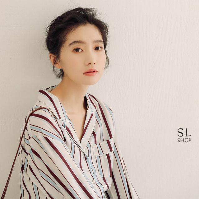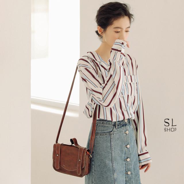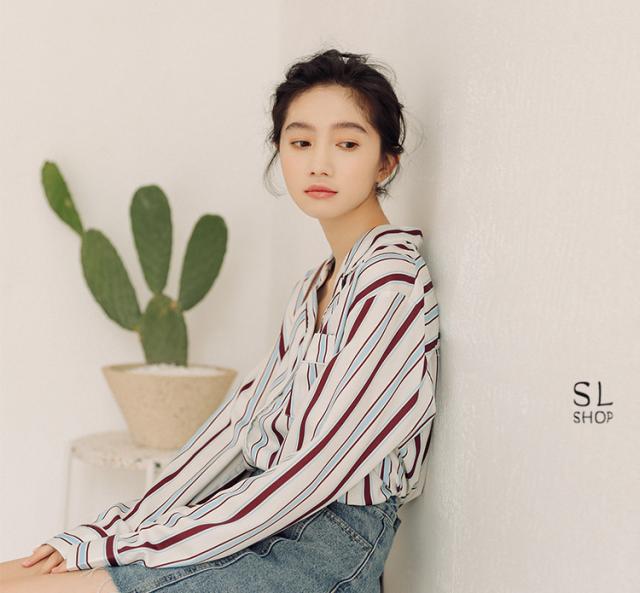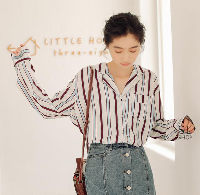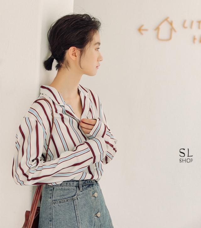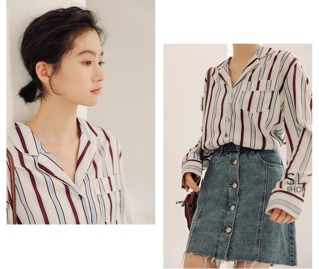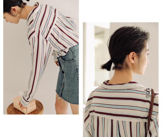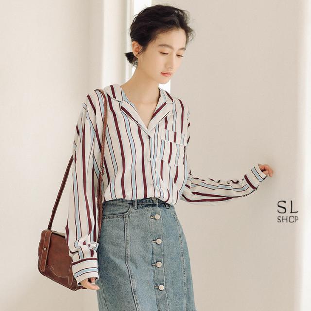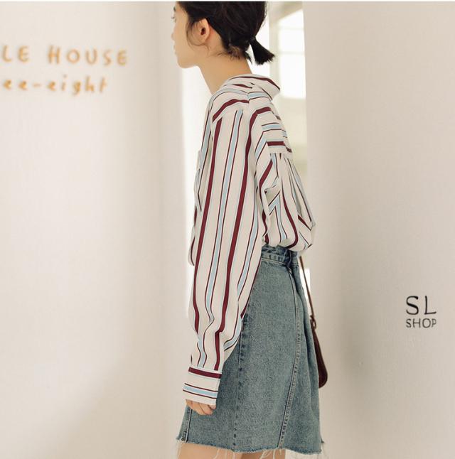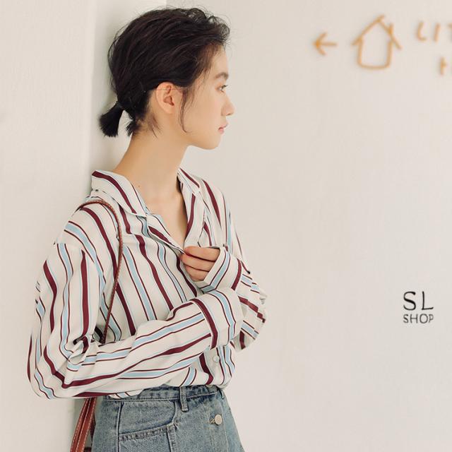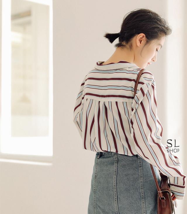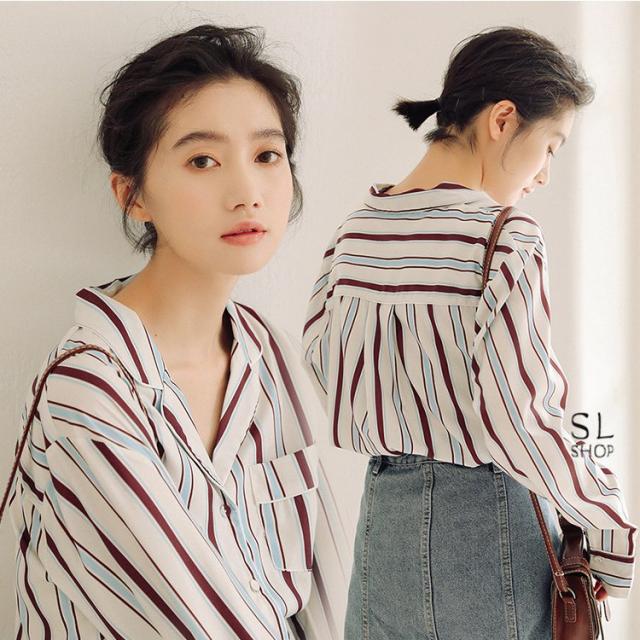 シャツ レディース OL 仕事 ブラウス 春 折襟 ストライブ柄 スキッパーネック トップス 長袖 おしゃれ