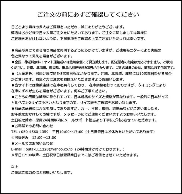 | ●サイズ詳細等の測り方はスタッフ間で統一、徹底はしておりますが、実寸は商品によって若干の誤差(1cm〜3cm )がある場合がございますので、予めご了承ください。 ●製造ロットにより、細部形状の違いや、同色でも色味に多少の誤差が生じます。 ●パッケージは改良のため予告なく仕様を変更する場合があります。 ▼商品の色は、撮影時の光や、お客様のモニターの色具合などにより、実際の商品と異なる場合がございます。あらかじめ、ご了承ください。 ▼生地の特性上、やや匂いが強く感じられるものもございます。数日のご使用や陰干しなどで気になる匂いはほとんど感じられなくなります。 ▼同じ商品でも生産時期により形やサイズ、カラーに多少の誤差が生じる場合もございます。 ▼他店舗でも在庫を共有して販売をしている為、受注後欠品となる場合もございます。予め、ご了承お願い申し上げます。 ▼出荷前に全て検品を行っておりますが、万が一商品に不具合があった場合は、お問い合わせフォームまたはメールよりご連絡頂けます様お願い申し上げます。速やかに対応致しますのでご安心ください。 | |